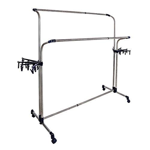 本体重量(約):5㎏ 耐荷重(約):50㎏サイズ(約):長さ115~210*幅60*高さ120~180㎝材質:ステンレス巻きパイプ & ABS& PP容量(目安約):洗濯物3~5人分、布団2枚大収納量●横縦自由伸縮●キャスター付き●移動便利●頑丈牢固●工具不要●組立簡単●ピンチハンガー2つ付き