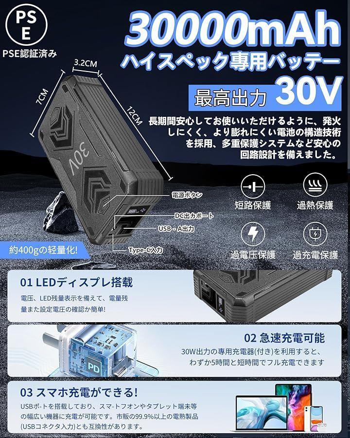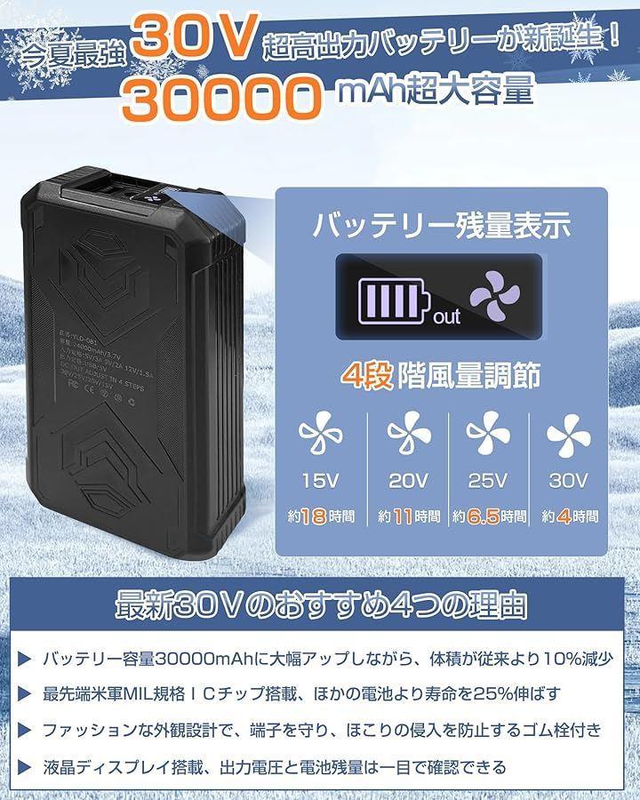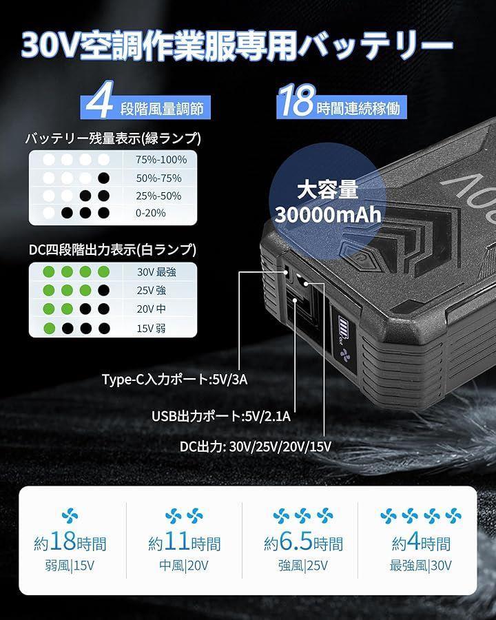 「30000mAh超大容量バッテリー・最大15時間稼働」30V空調作業服バッテリーは容量が30000mAhに大幅アップしながら、体積が同容量30000mAhのバッテリーより10%小さくなっています。