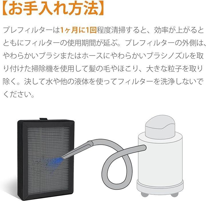 プレフィルターの外側は、やわらかいブラシまたはホースにやわらかいブラシノズルを取り付けた掃除機を使用して髪の毛やほこり、大きな粒子を取り除く。