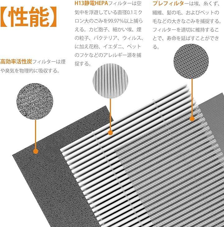 カビ胞子、細かい埃、煙の粒子、バクテリア、ウィルス、に加え花粉、イエダニ、ペットのフケなどを捕捉する。