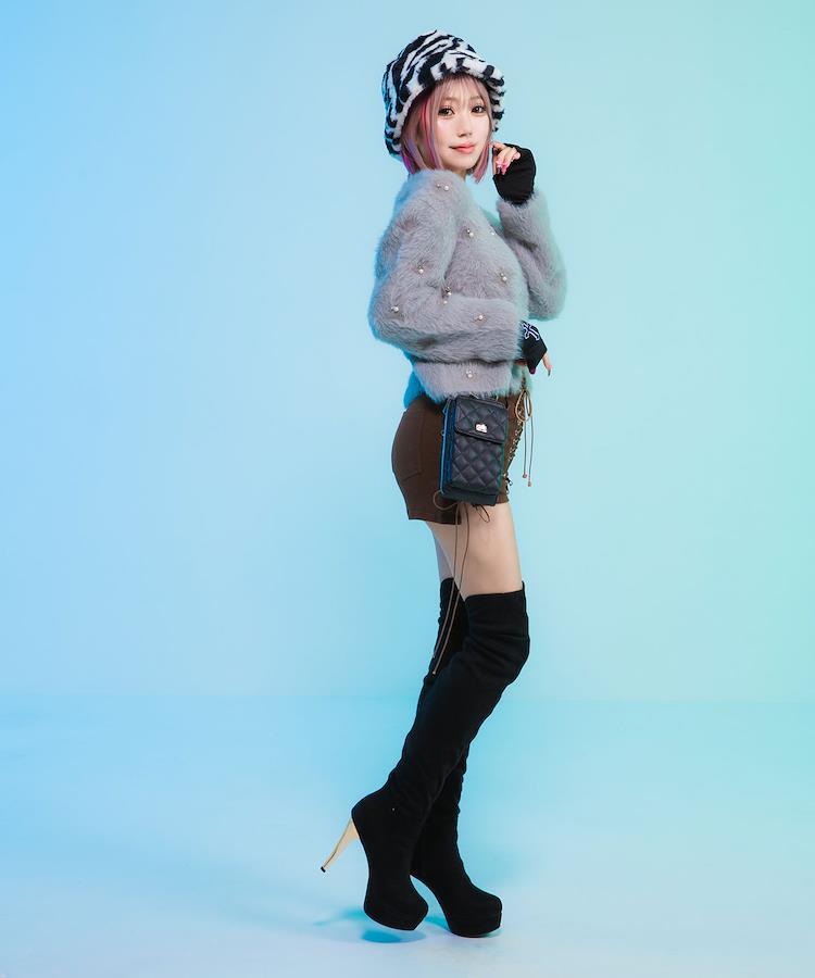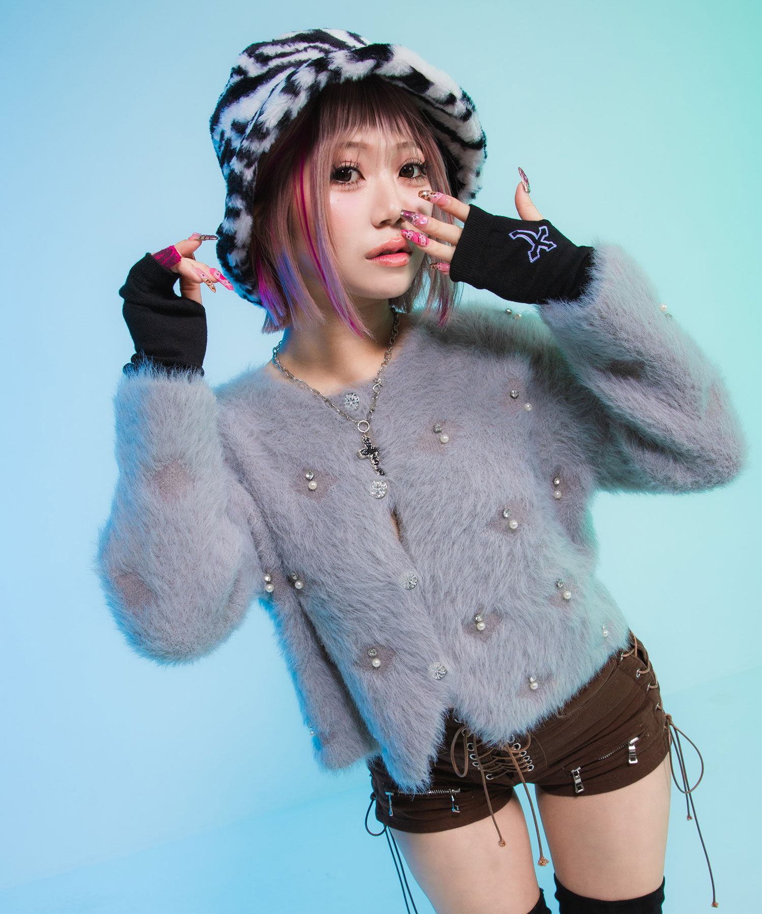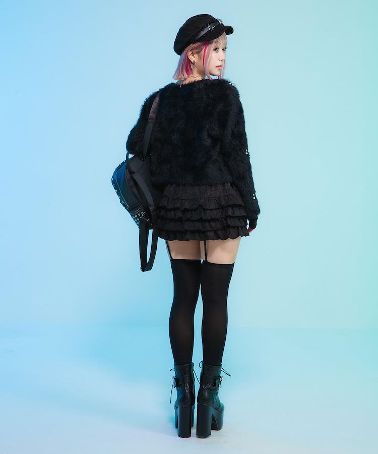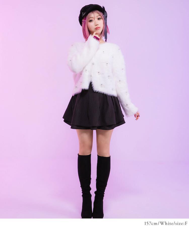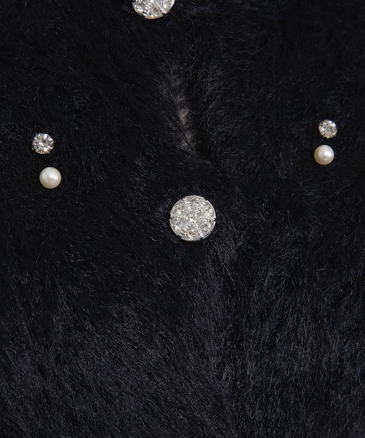◆Design全体がシャギー素材で仕立てられており、ふわふわとした立体感が女性らしさを引き立てます。さらに、フロント部分やボタンにビジューがあしらわれているため、華やかでゴージャスな雰囲気。シンプルな形でも、素材と装飾のディテールで存在感があります。ふんわりとした風合いで、冬でもしっかり保温しつつ軽やかな見た目を保ちます。デートやパーティーシーンにもぴったりのアイテムです。