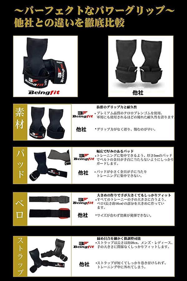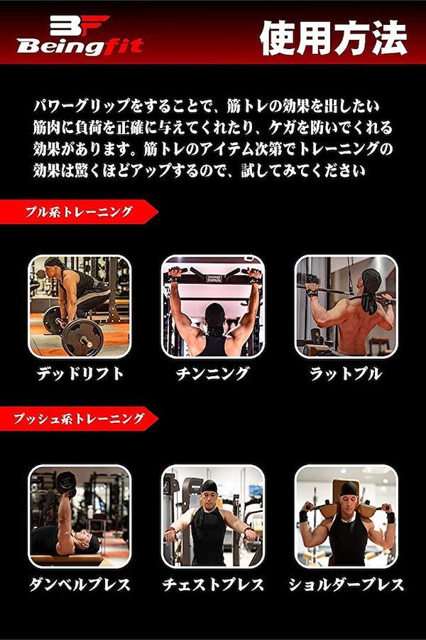 ・「現役フィジカー監修」Beingfit's 社の製品は、15年以上のトレーニング経験を持つ現役フィジカー監修のもと、様々なブランドの筋トレグッズをテストし問題点を、2年間の歳月をかけ改善を繰り返し生み出された、筋トレのパワーグリップです。