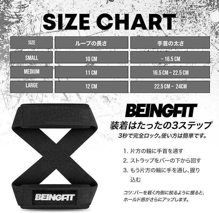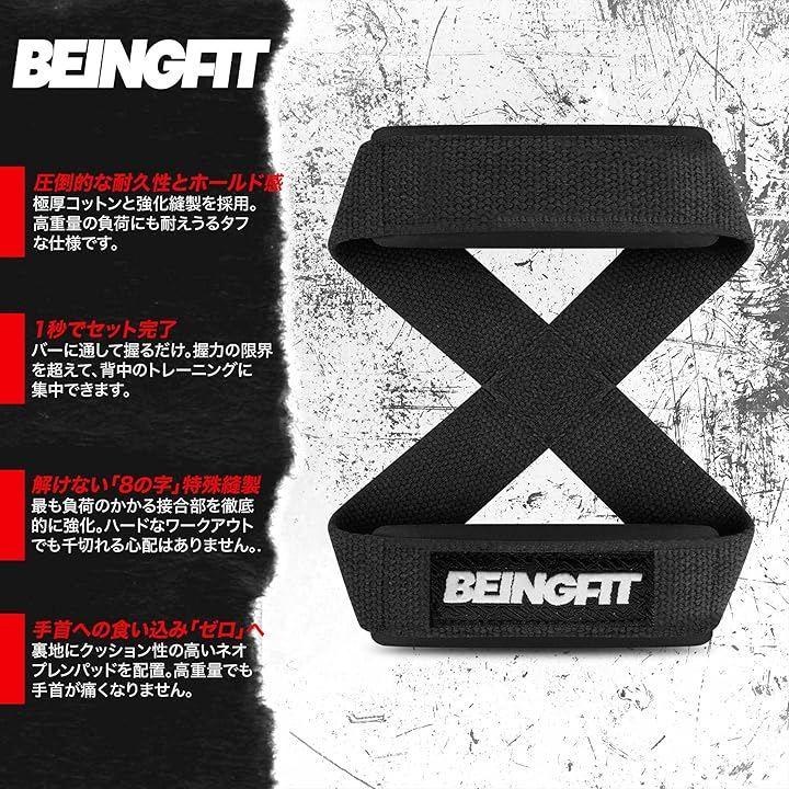 Beingfitの8の字リストストラップは、筋トレ・パワートレーニング・自重トレーニングに幅広く使えるリストストラップです。