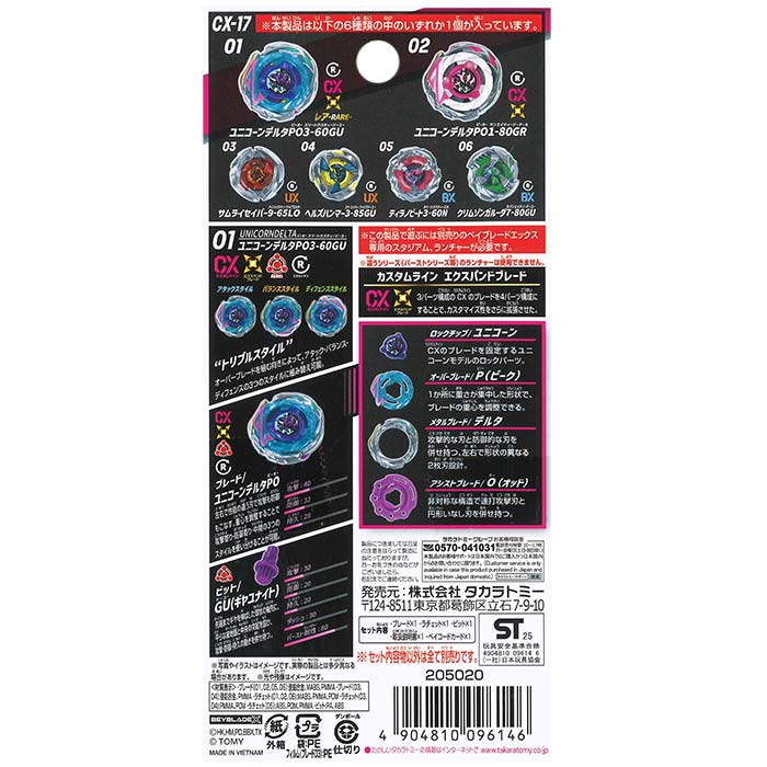 レアの「ユニコーンデルタPO3-60GU」は、オーバーブレードを組む向きによって、アタック・バランス・ディフェンスの3つのスタイルに組み換え可能で、様々な相手に対応できるバランスタイプのベイブレードです。