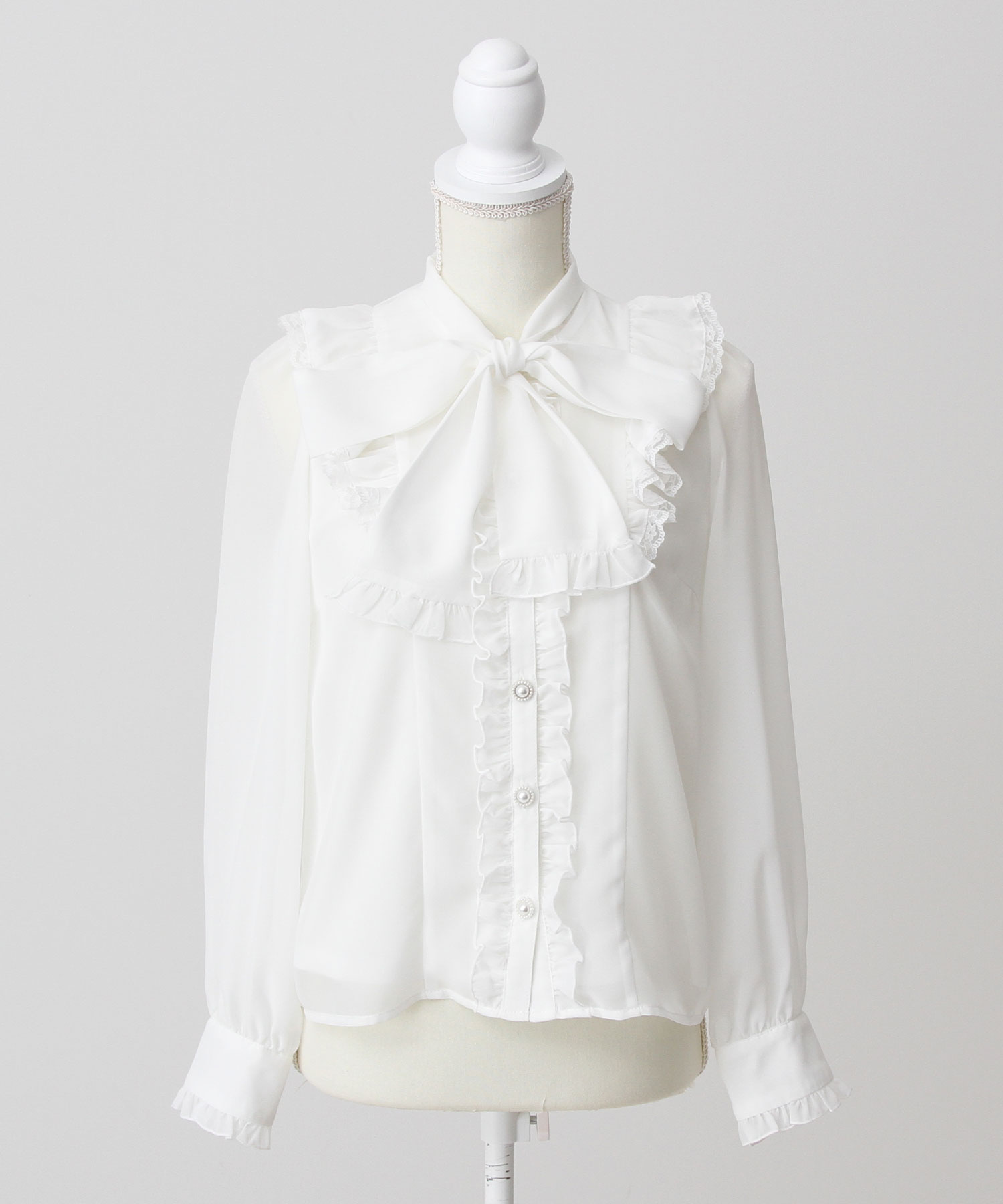 さりげないかわいさと上品さのあるフェミニンボウタイリボンブラウス【デザイン】フリルとさりげないレースがあしらわれたかわいくも上品なデザインのボウタイブラウスです。ボウタイリボンにはさりげないフリルがかわいく、一段階大人っぽくかわいらしいコーデに変身♪前立てにはパールボタン、カフスにもさりげなくついています。シフォン生地なので袖は少し透け感が感じられるのがポイントで、これからの季節にもぴったり♪どんなコーデにも万能に合わせられるのでおすすめのアイテムです!【素材】シフォン生地を使用しています。身頃部分に裏地付きです。濃色下着が透けることがありますのでインナー着用をオススメします。【コーディネート】マーメイドスカートや上品めなハイウエストデザインスカートとの相性ぴったり♪かわいいのは好きだけれど、上品で大人っぽい雰囲気のコーデがしたい方におすすめです。今までのDearMyLoveよりも一つ大人になったコーデはいかがでしょうか?《透け感》カラーによってあり 《生地の厚さ》普通 《裏地》あり 《伸縮性》なし《生産国》中国
