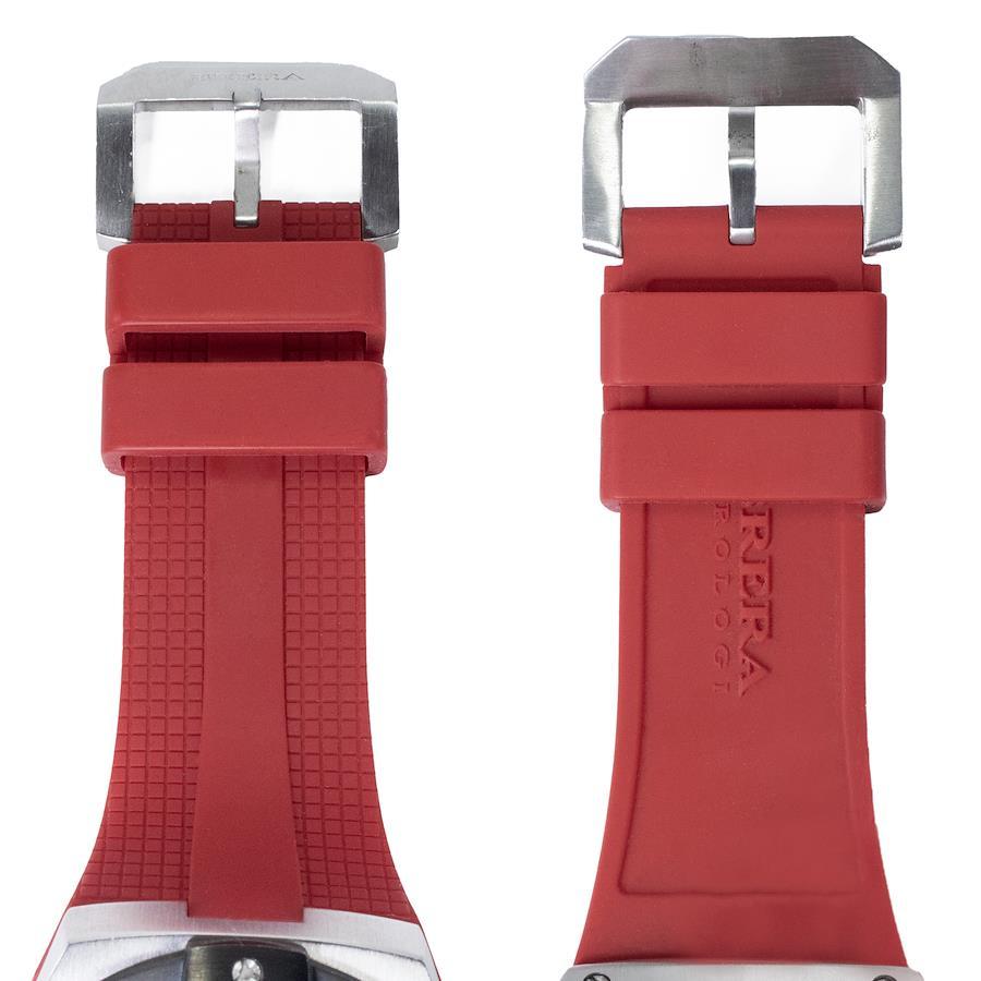 48mmという迫力満点の大型ケースと、鮮やかなレッドカラーが、腕元で圧倒的な存在感を放ちます。