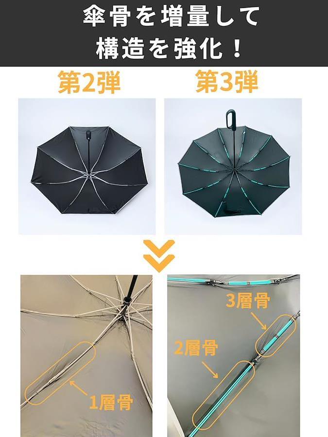 「傘骨を増量して構造を強化。」傘の骨組みを強化しました。