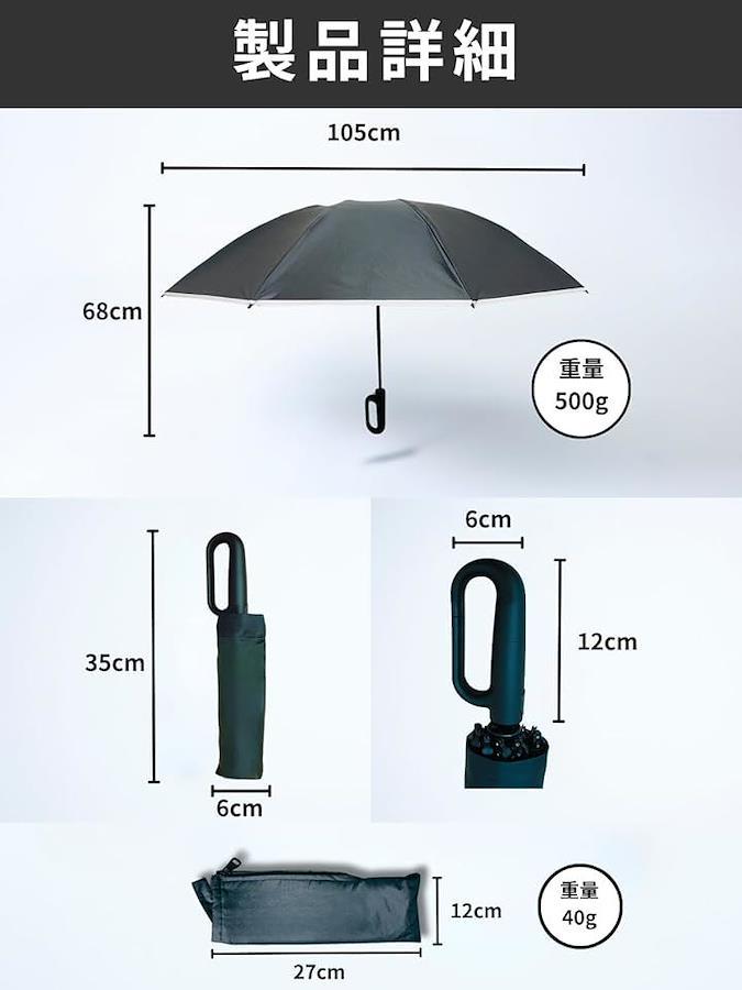 「製品詳細」<開放時のサイズ> 幅:105cm 高さ:68cm <収納時のサイズ> 幅:6.0cm 高さ:35cm <傘本体の重量> 約500g <収納ケースの寸法と重量> 寸法:幅12cm 高さ27cm 重量:約40g *初めて傘を開く時、逆そりするなどの正常に開かない可能性があります。