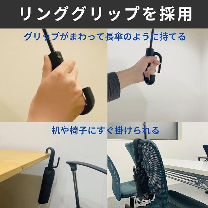 「リンググリップを採用」・グリップがまわって長傘のように持てる・机や椅子にすぐ掛けられる