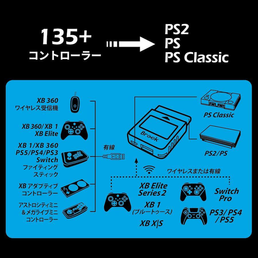 (Compatible with Retro Games) This converter allows you to connect your controller to your PS2/PS/PS Classic game console. Supports over 125 kinds of commercially available controllers. Your favorite controller allows you to play your favorite games without limitation Compatible controllers: Wireless connection: PS5, PS4, PS3, XB one, XB Elite2, Switch Pro wired connection: XB 360. *Compatible with your controller/joystick, please see the official Brook website Compatible game consoles: Compatible with PS2/PS/PS Classic consoles. You can use it by switching to X-Input mode on your computer Remap and 5-stage TURBO function: You can freely control the placement of the buttons on the controller. Support 5 levels TURBO settings: 5, 10, 15, 20, 25 clicks/s Package Includes: Wingman PS2 x 1, instruction manual x 1. If you have any questions about the product, please feel free to contact us through your order history