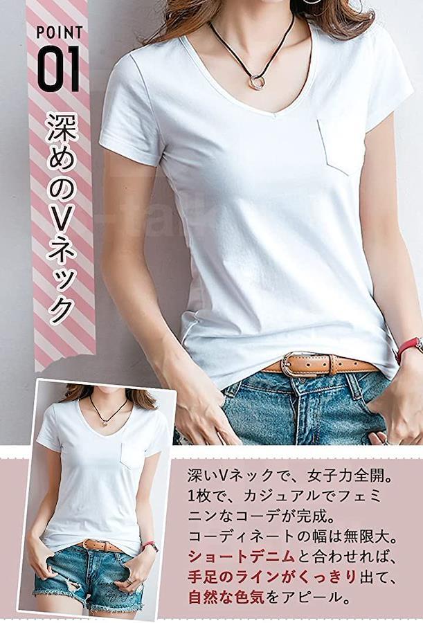 デコルテを奇麗に見せるVネック。1枚で、カジュアルでフェミニンなコーデが完成します。