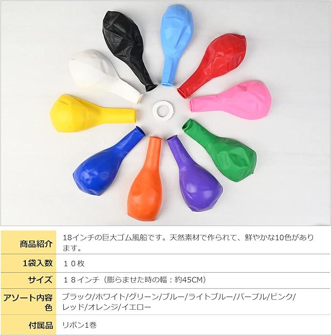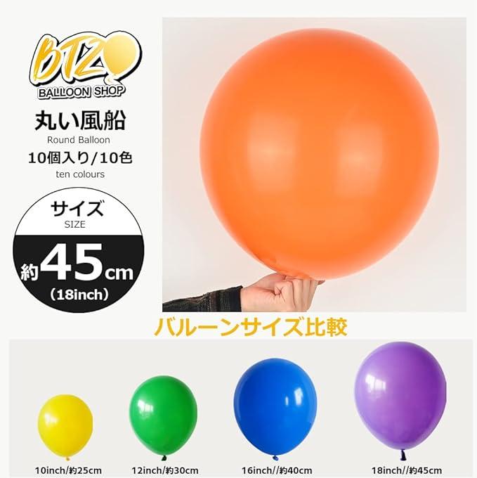 ■商品説明■直径約45センチの大きな風船です。10色で組み合わせるゴムバルーンセットです。 ■内容物:風船10枚(ブラック/ホワイト/グリーン/ブルー/ライトブルー/パープル/ピンク/レッド/オレンジ/イエロー各1枚)、リボン1巻 ■大型イベンや運動会などに人気のジャイアントバルーン!18インチのサイズは通常の風船より、大きくて人目に惹くので、露天会場や少し大きなお部屋に飾りつけなどをおススメです。色は豊富、鮮やかな色の組み合わせは風船をより美しくして、パーティーに飾ると華やかになります! ■BTZOバルーンの色彩・サイズ・シェイプバリエーションが豊富で、誕生日会だけでなく、結婚式や歓送迎会、卒園式、入園式、運動会、ハロウィン、クリスマス、展示会、リリース(放天)やお祭りなどのアトラクションや販促用としてもよく使われています。 ■ご購入後すぐに中身の確認をお願いいたします。商品の品質には万全を期しておりますが、万一不良・配送中の破損または注文内容が異なる場合は恐れ入りますが「注文履歴」→「出品者に連絡する」から弊店と連絡してください。再発送または返金等誠心誠意に対応させていただきます。受付は日本語、英語が話せるスタッフが対応しています。また、バルーン製品には、小さな部品が入っています。間違って飲み込む危険がありますので、6才以上のお子さまにお勧めします。?もっと見る
