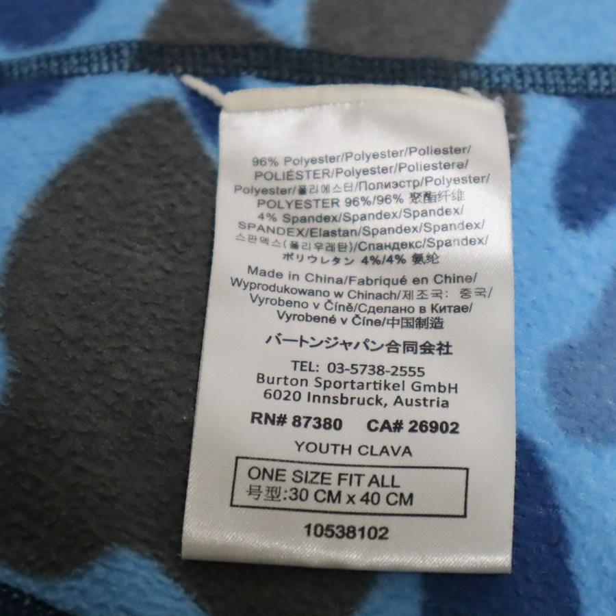 【詳細】■ 商品名・モデル:BURTON YOUTH CLAVA(ユースクラバ)■ ブランド:BURTON(バートン)■ カラー:ブルー系カモフラ■ サイズ:ONE SIZE(キッズ用)■ 状態:- 傷・汚れ:特に目立つものはありません- 生地の毛玉やほつれも少なく比較的良好です- 使用感:リユース品のため軽い使用感あり■ 素材:ポリエステル96%/スパンデックス4%■ 付属品:本体のみ