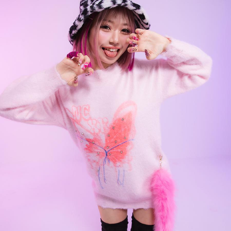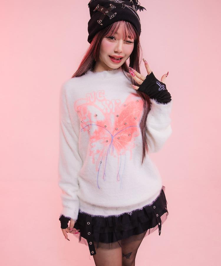 ◆Design蝶(バタフライ)モチーフのビジューが施され、上品でフェミニンなデザインが特徴です。柔らかいニット素材を使用し、快適な着心地が楽しめます。