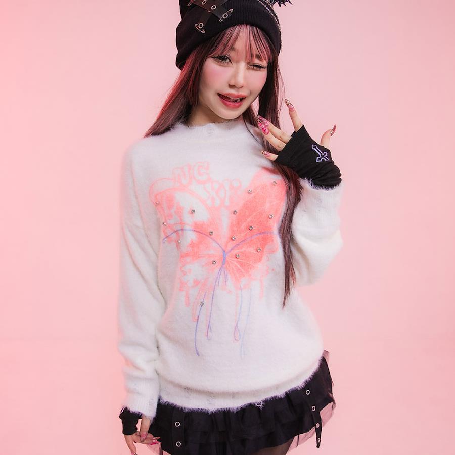 ◆Design蝶(バタフライ)モチーフのビジューが施され、上品でフェミニンなデザインが特徴です。柔らかいニット素材を使用し、快適な着心地が楽しめます。