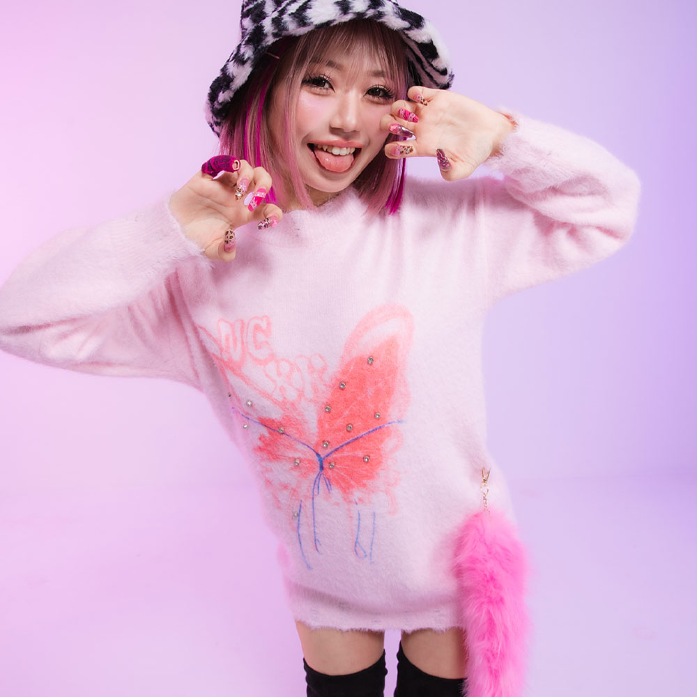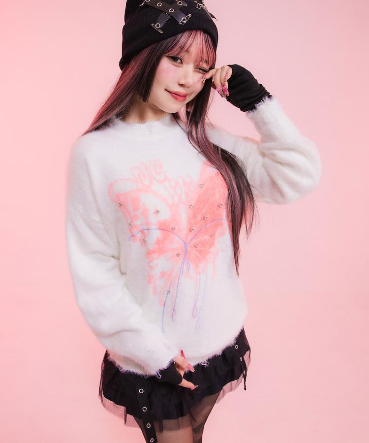 ◆Design蝶(バタフライ)モチーフのビジューが施され、上品でフェミニンなデザインが特徴です。柔らかいニット素材を使用し、快適な着心地が楽しめます。
