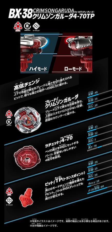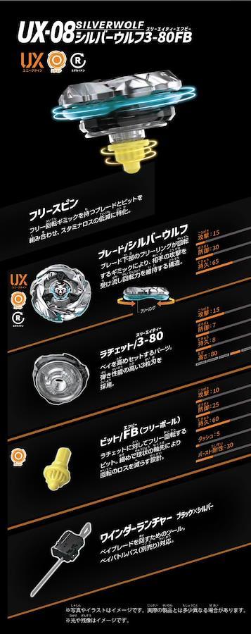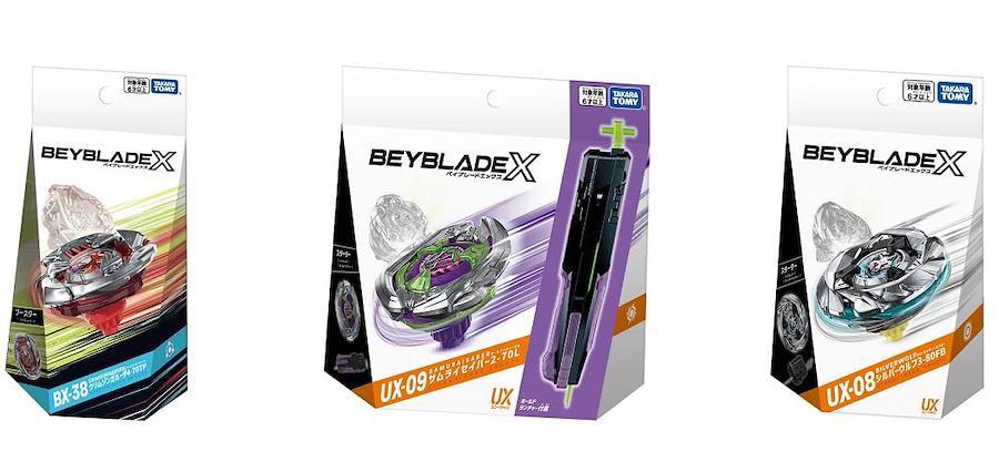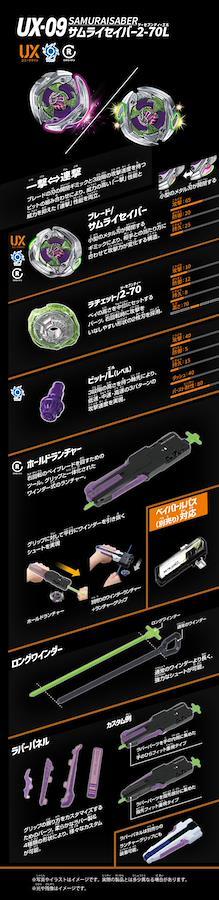 【BX-38】上面はスタミナロスが少なく、底面はカウンターに優れた攻撃と上下で性能が異なるブレードと、高さが切り替えられるビットにより、様々な高さの相手への対応力に優れたぺイ。【UX-09】ブレードのメタルを外周に多く配分し、固有の性能に特化したユニークラインのぺイ。ブレードの刃の開閉ギミックと3段階の攻撃速度を持つビットの組み合わせにより、威力の高い「一撃」性能と威力を抑えた「連撃」性能を両立したぺイ。グリップ一体型でシュート時の安定性が高いホールドランチャー、通常のワインダーより長く強力なシュートが撃ちやすいロングワインダー、ラバー製でグリップの握りやすさを調整可能な4種類のラバーパネルが同梱。【UX-08】ブレードのメタルを外周に多く配分し、固有の性能に特化したユニークラインのベイ。フリー回転ギミックにより相手の攻撃を受け流し回転力を維持するブレードと、フリー回転ギミックで持久力を維持しやすいビットの組み合わせでスタミナロスの低減に特化している。