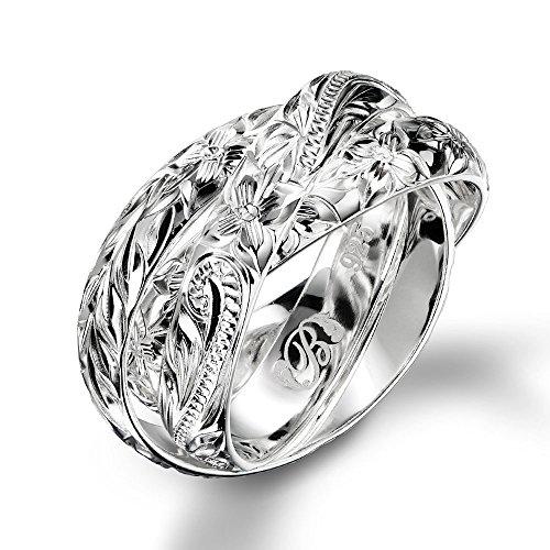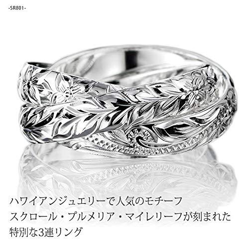 3つのリングにはそれぞれ異なる模様が施されております 「永遠の愛」を意味する波模様スクロール 「親愛」を意味する南国の花プルメリア 「絆」を意味する聖なる葉マイレリーフ材質 シルバー925寸法 幅3.8mm 厚1mm(1本の寸法です) ◆サイズ展開 5号~24号リングの内側に文字刻印(無料)が可能です。(刻印可能文字数:20文字以内 最大1行)商品をカートに入れた後、カート画面で「ギフトの設定」にチェックを入れ、ギフトメッセージ欄に『ご希望の書体』と『ご希望の刻印内容』を入力してください。※ページ上部のスライド画像に文字刻印の手順・書体・注意点が記載されております。ご希望の場合は必ずご確認下さい。この商品は追加で誕生石入れできません。文字刻印及び誕生石のセッティングは全て受注生産品、特注制作品となります。◆何かご不明な点がある場合は、販売元ページよりお問い合わせ下さい。【お問い合わせ品番:SR801】