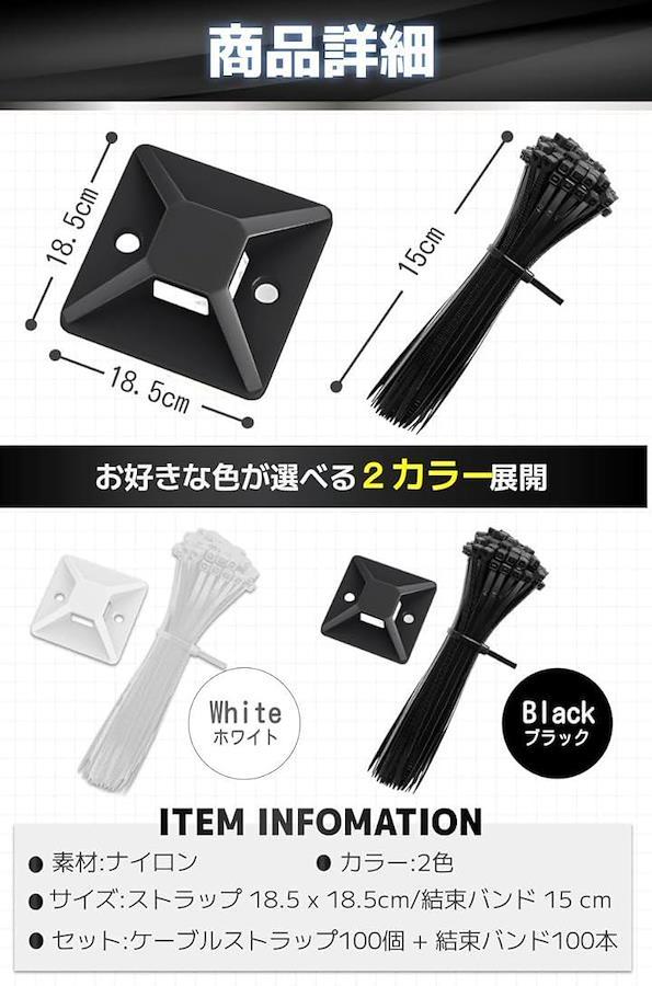 「商品詳細」素材:ナイロンサイズ:ストラップ 18.5 x 18.5cm/結束バンド 15 cm/セット:ケーブルストラップ100個 + 結束バンド100本/カラー:2色/