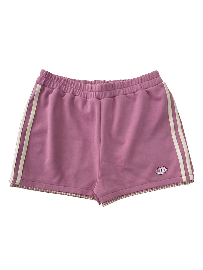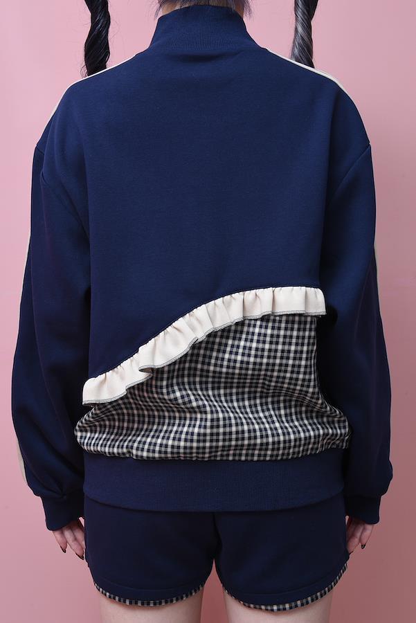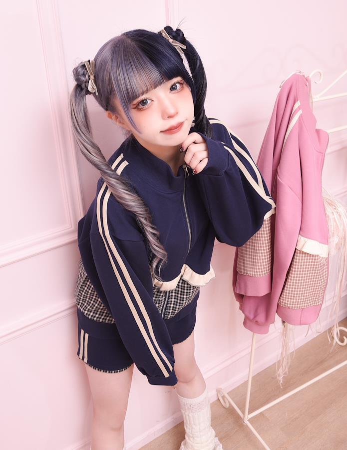 パジャマとジャージをミックスさせたトラックジャケットとチェックパンツです。胸元の刺繍は、かちゅ氏本人がデザインしました。チェック生地との切替は曲線になっていて、他にはないデザインです。オフホワイトのフリルとラインが、ジャージ生地にマッチしている”可愛すぎない”、可愛さです。ショートパンツの裾部分のチェック生地がチラ見えするデザインです。ミニ丈でラフに着用できます。オフホワイトのラインが、ジャージ生地にマッチしている”可愛すぎない”、可愛さです。