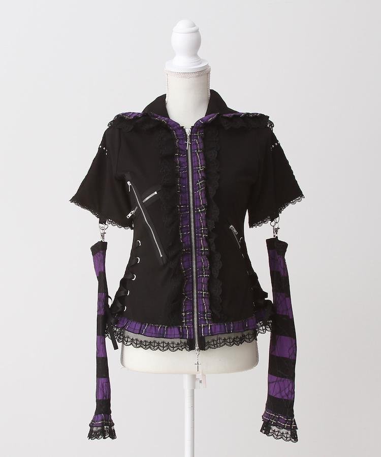 フロントにはシルバージッパーで立体的な交差十字を形成し、上下開閉可能なダブルジッパーには十字架チャームが揺れる仕様。