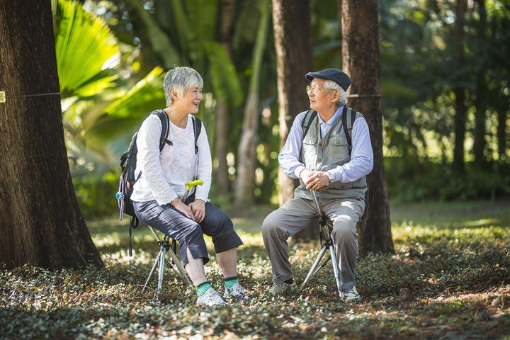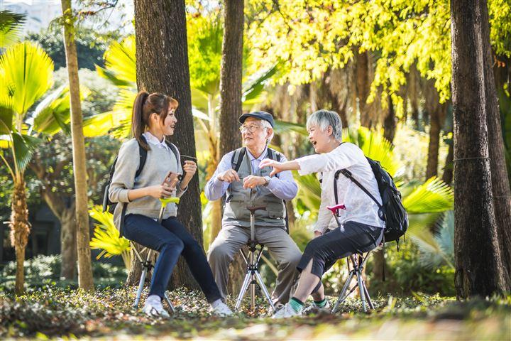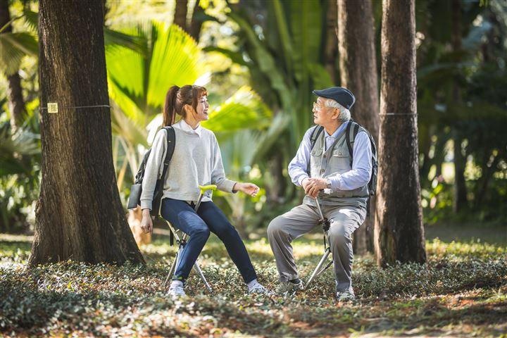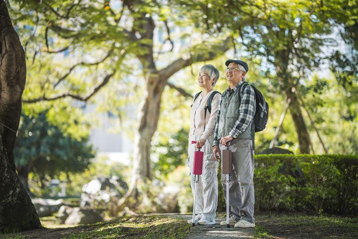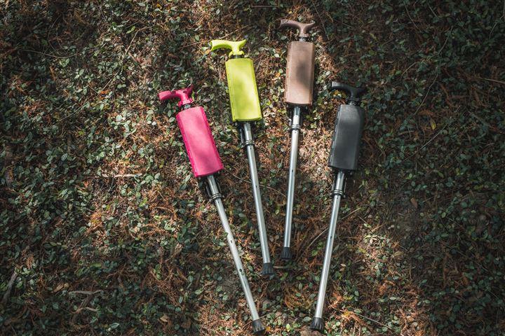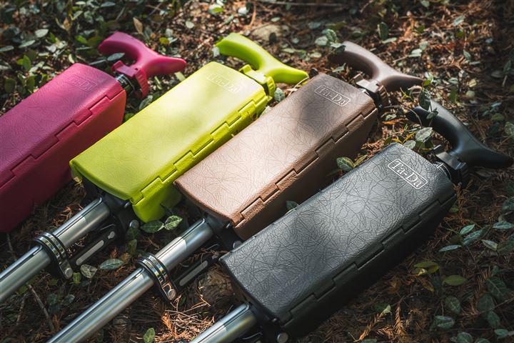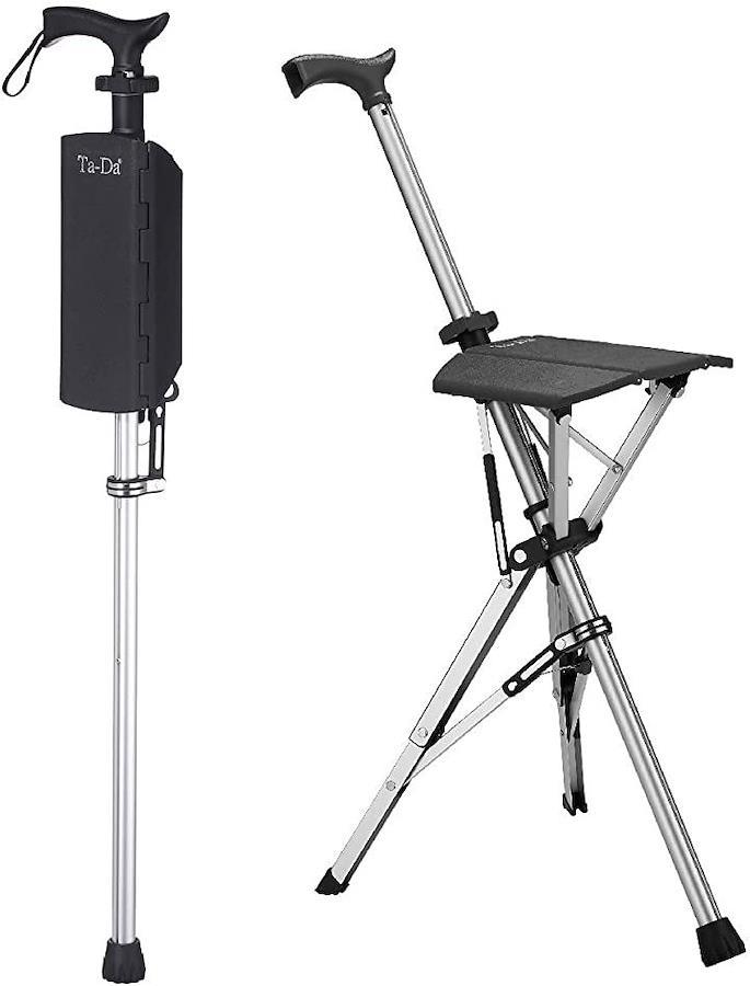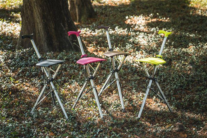 「杖と椅子の2つを1つに」ワンタッチで杖から椅子に。どこでも座ることができます。