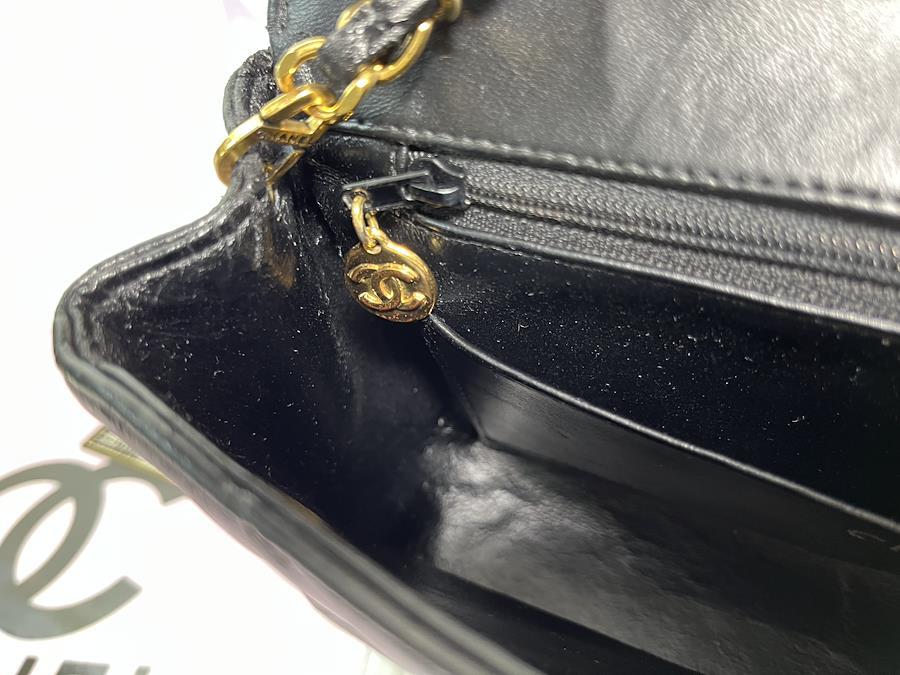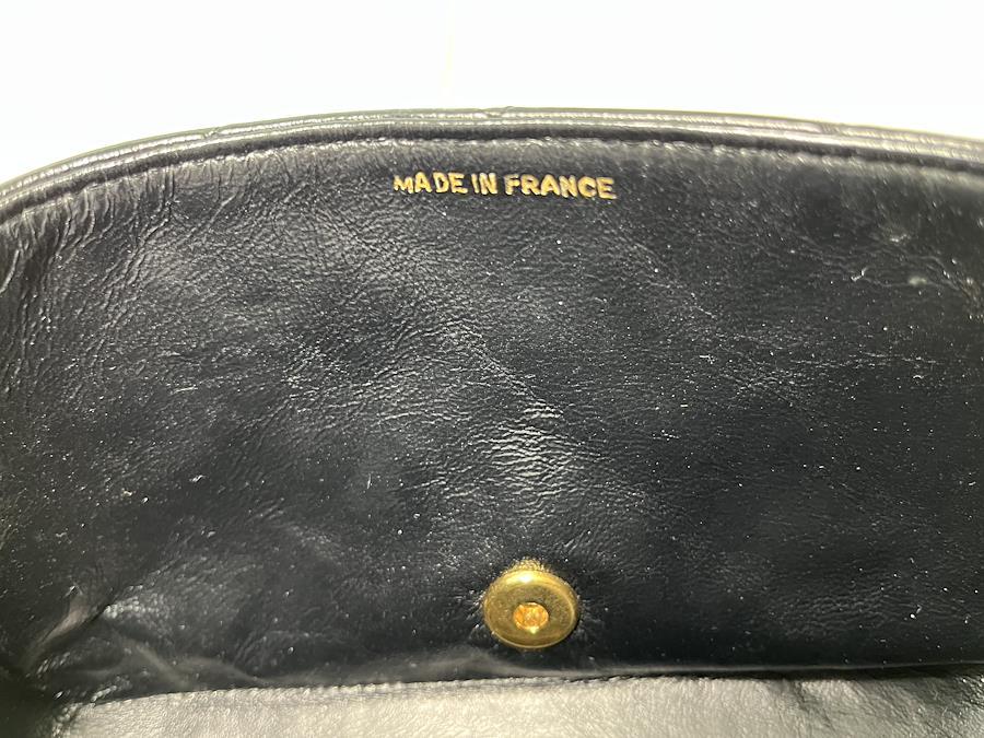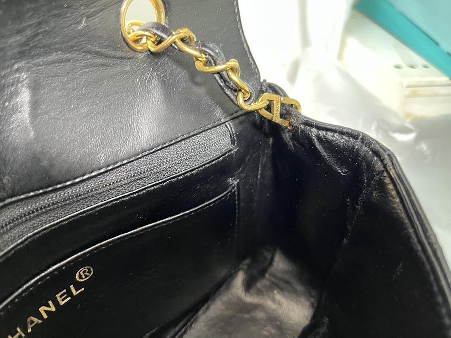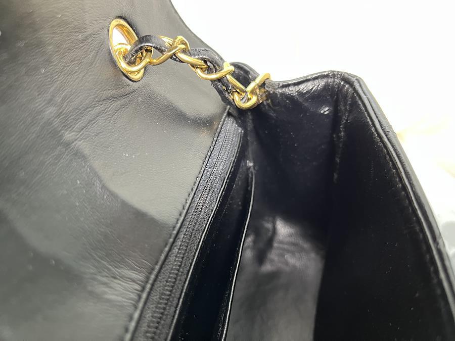 【ストラップ・金具】チェーンストラップの革部分に少々ダメージがありましたが、補色・補修にてリペア済み。金具は若干のくすみが見られるものの、全体としては綺麗なゴールドトーンを保っています。