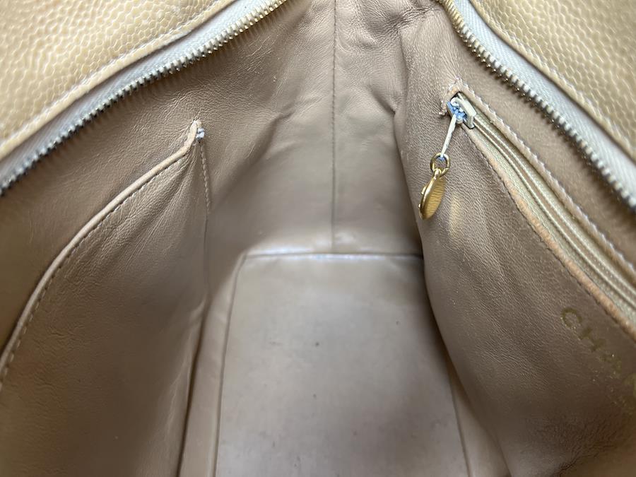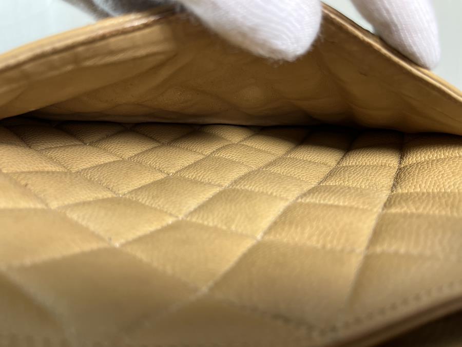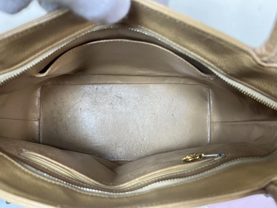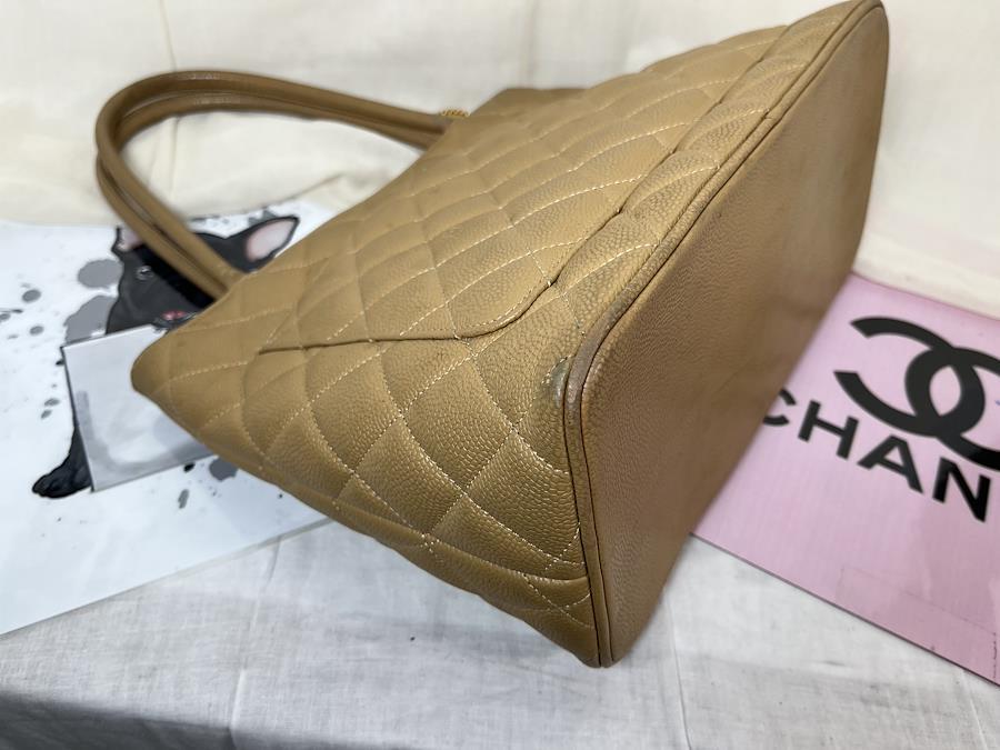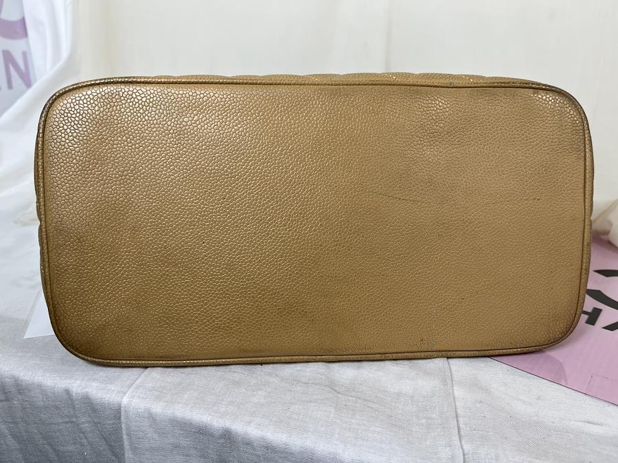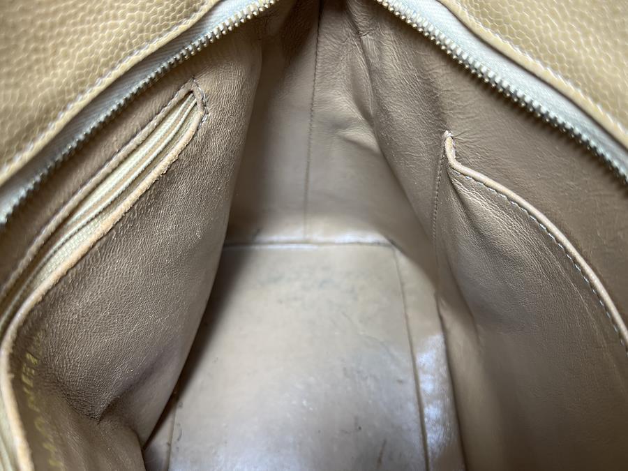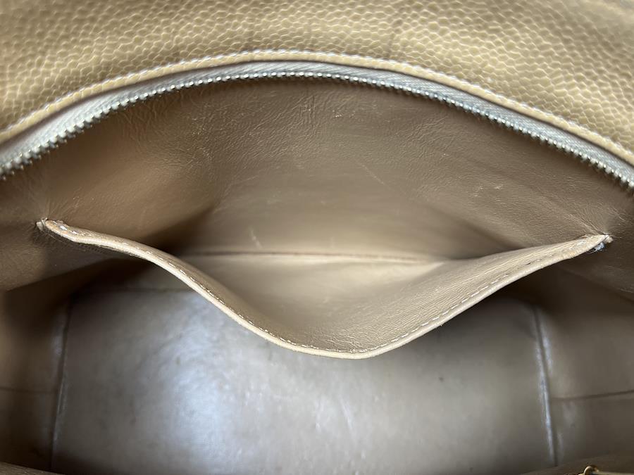 ・ハンドル付け根に補強(補修)跡あり・持ち手(ショルダーストラップ)は半分程度自立します・バッグ角、底、ストラップ部分に擦れ・汚れあり・大きな裂けや破れ、使用に支障のあるダメージはありません・キャビアスキン特有のハリと耐久性は十分に保たれています