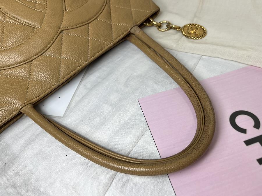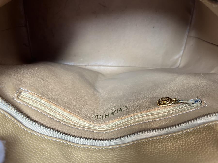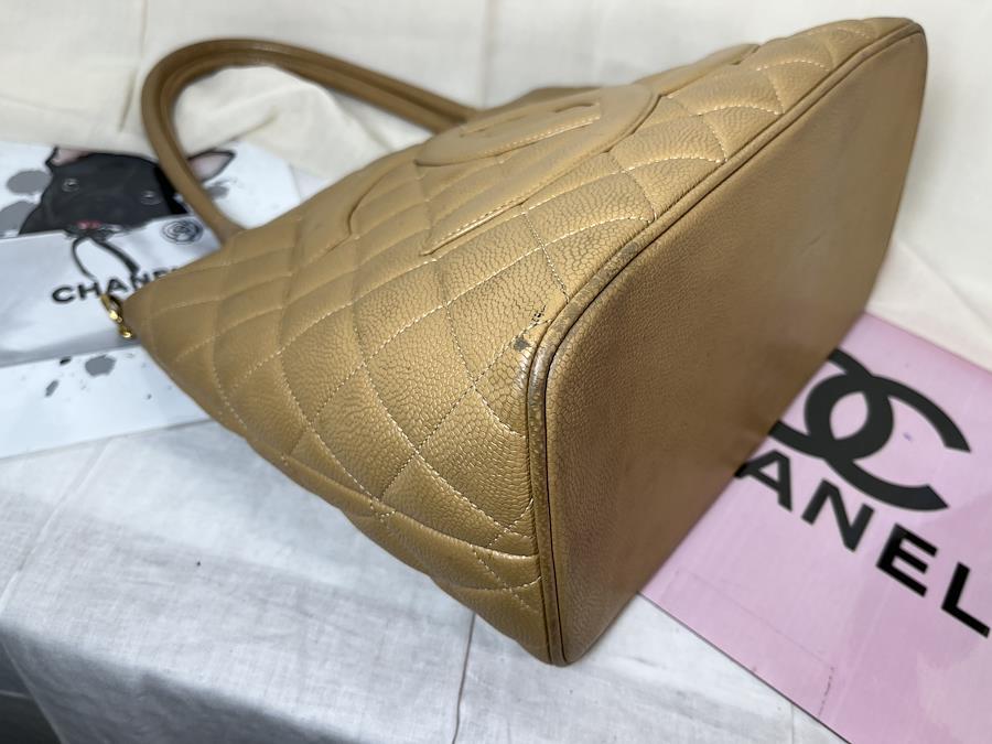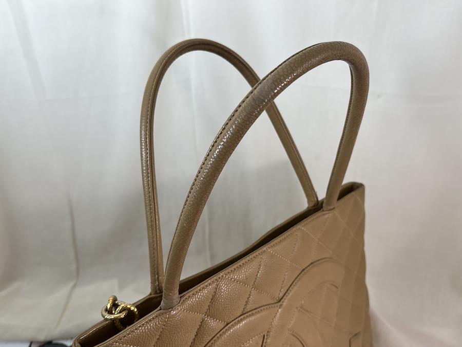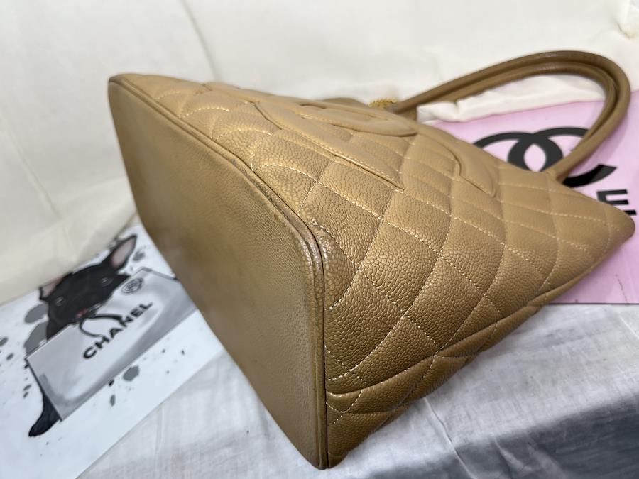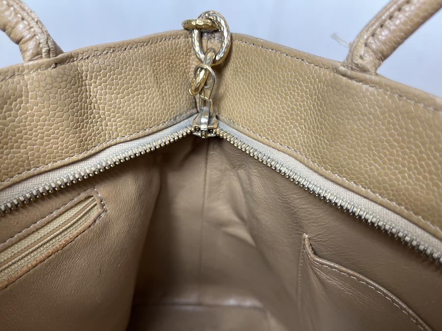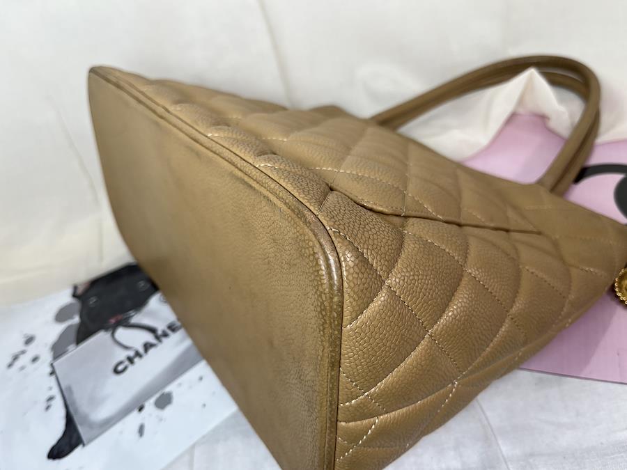 ・ハンドル付け根に補強(補修)跡あり・持ち手(ショルダーストラップ)は半分程度自立します・バッグ角、底、ストラップ部分に擦れ・汚れあり・大きな裂けや破れ、使用に支障のあるダメージはありません・キャビアスキン特有のハリと耐久性は十分に保たれています