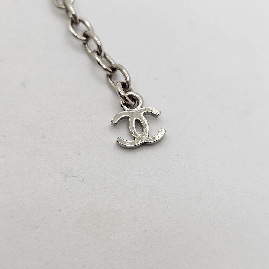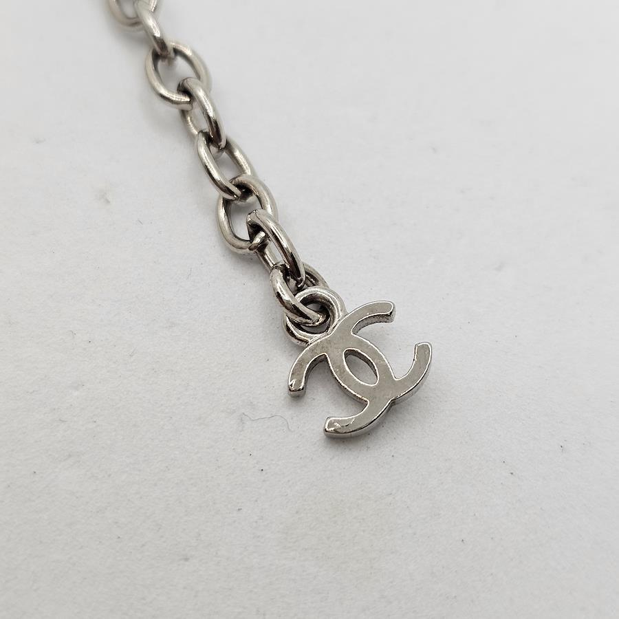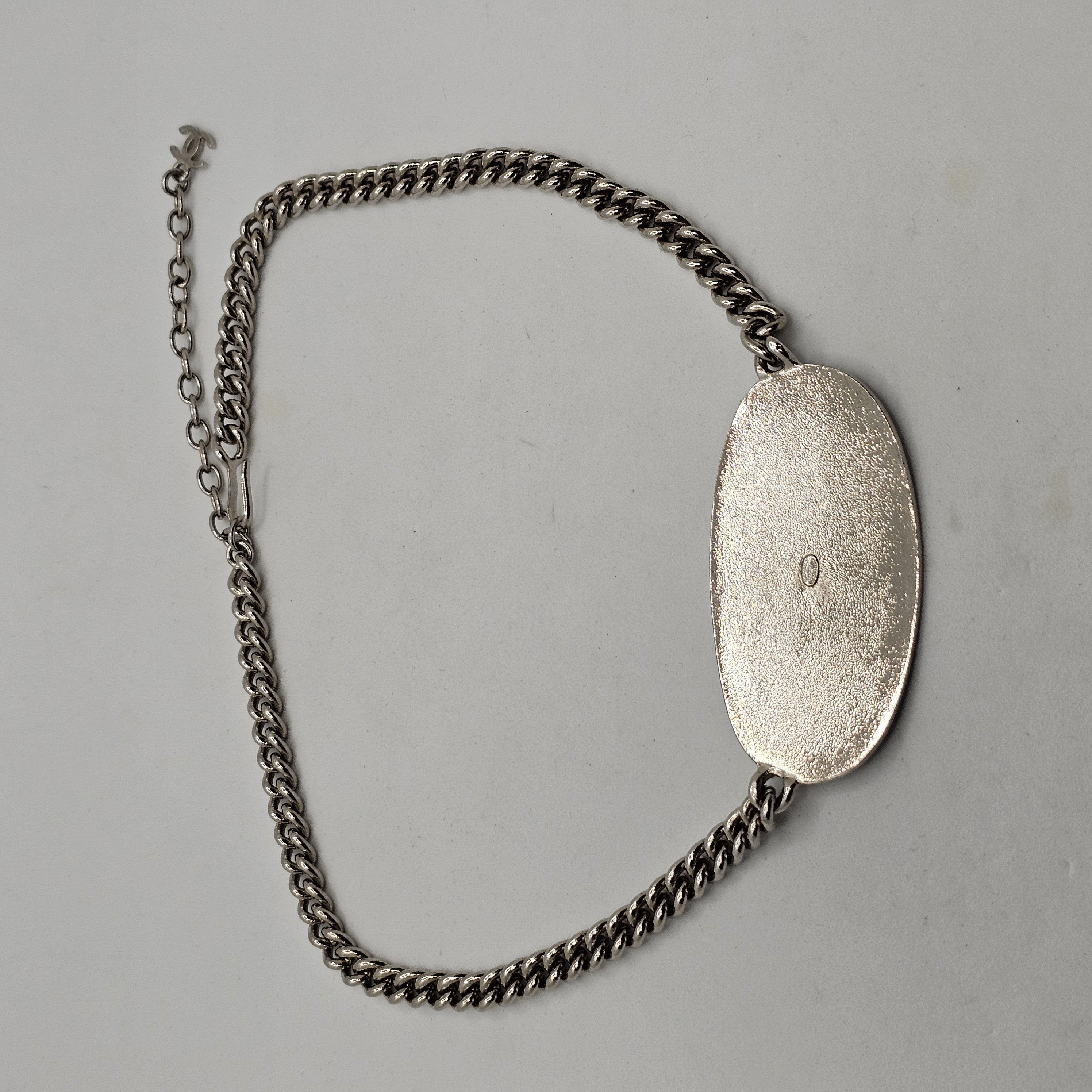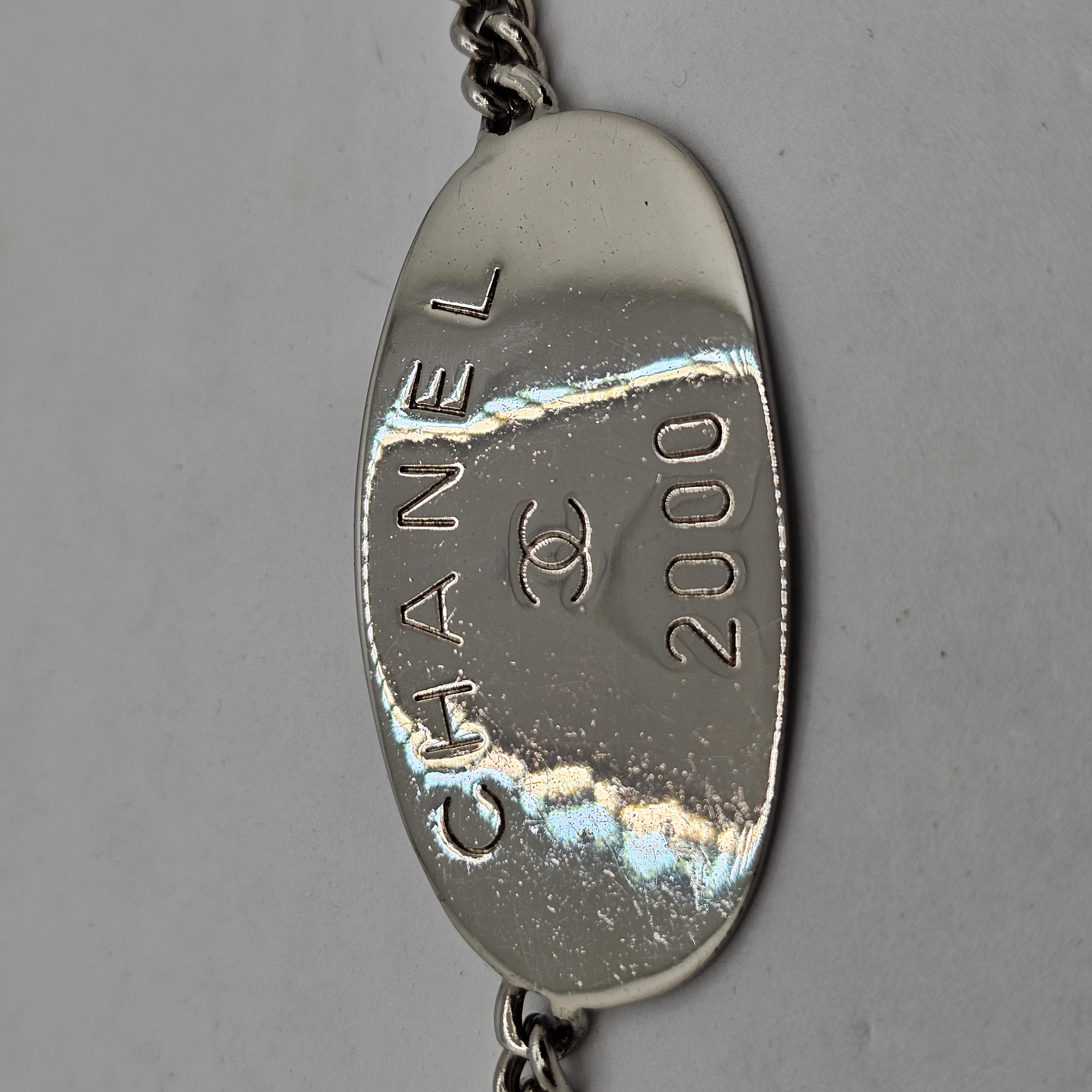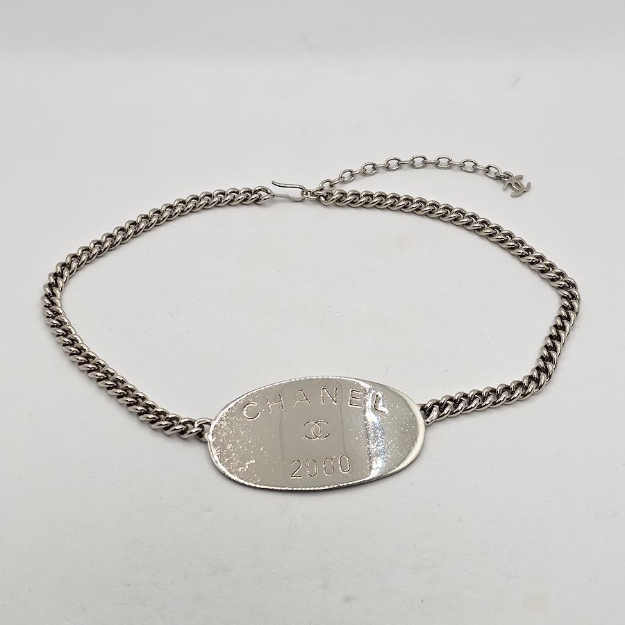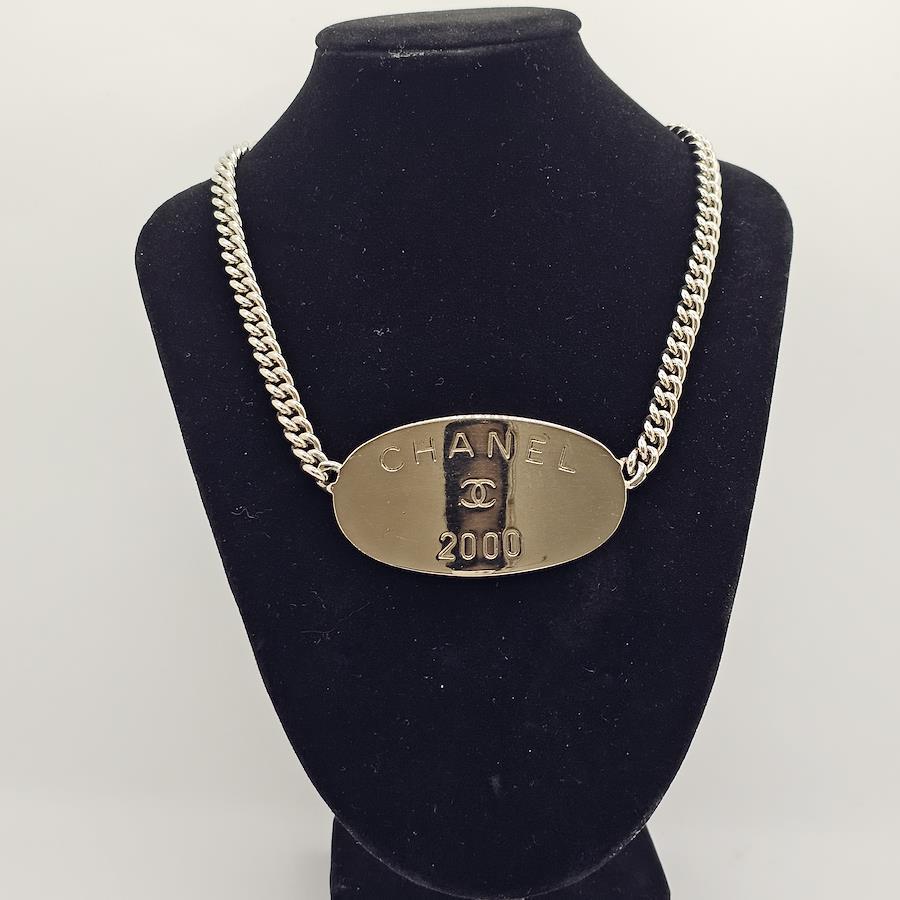 CHANELのチョーカータイプのネックレスです。 大きなオーバルプレートには「CHANEL」「ココマーク」に加え、大変希少な「2000」の年号刻印が入っています。これは、2000年のコレクションで発表された限定品であることを示しており、現在では入手困難なコレクターズアイテムです。 重厚感と光沢のあるシルバーカラーで、ファッションの主役になる存在感があります。