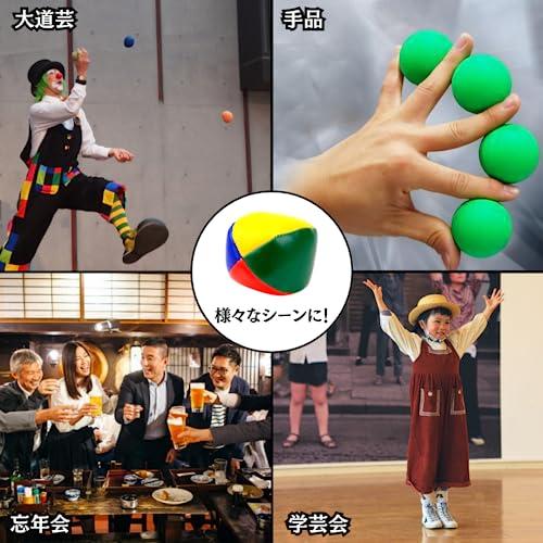 【色鮮やかなジャグリングボール】色鮮やかでよく目立つデザインの、カラフルなジャグリング用ボール(西洋お手玉)です。4色の美しいカラーリングで、他のお手玉より目を引くこと間違いなし!一味違う演出のお供として、是非ともお役立て下さい。 【練習用として最適】使いやすい5cmのスタンダードサイズで、視認性が高くボールの軌道を確認しやすいカラーのため、ジャグリングの練習用として最適です。カラフルで観客からの見栄えもとても良いので、人前でのパフォーマンス用としてもおすすめ! 【程よい柔らかさで使いやすい】握りやすく弾まない、程よい柔らかさの素材を使用しており、初心者の練習用に打ってつけです。顔や体に当たっても痛くないため、お子様やお年寄りにも安心してお使い頂けます。PUレザー製で汚れに強く、水拭きで簡単に綺麗にできるため、公園などの屋外でも汚れを気にせず使用可能です。 【様々なシーンで◎】大道芸は勿論、余興やかくし芸・手品、忘年会、新年会、クリスマス、学芸会、その他イベントなど幅広い場面で使えます! 【製品仕様】直径:約5cm 重量:45g/個 素材:PUレザー(表面)、EPP粒子(中身) 対象年齢:6歳以上 【安心の返金保証】本製品は購入から30日間の返品保証付きとなります。日本人スタッフが迅速・丁寧にご対応いたしますので、安心してお買い求めください。