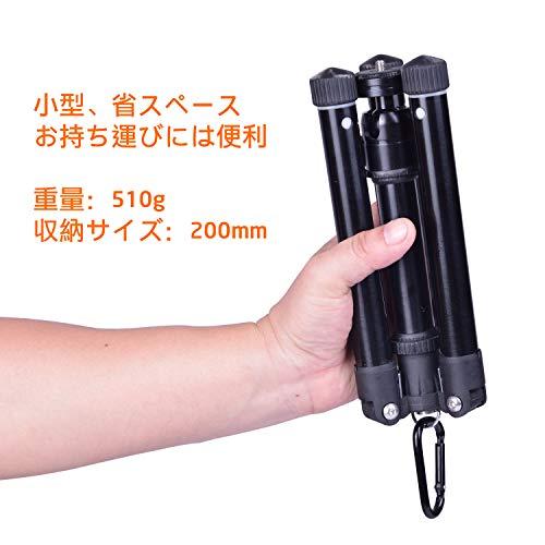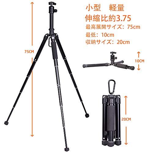 ミラーレス一眼、コンデジ、ビデオカメラまたスマホも対応した小型三脚です(スマホの場合はスマホホルダーが必要です、スマホホルダーは別売り)。 素材:アルミ合金と強化樹脂です。軽量:約510gです。コンパクト性重視で、収納サイズは約僅か20cmです、伸ばすと最大は75cmぐらいになります。3段開脚仕様で、脚の角度は三階段調整可能です。1/4インチネジ穴のコンパクトカメラ、ミラーレス一眼等軽量なカメラ等には最適です、1/4インチネジ穴の小型ビデオカメラも対応可能です。自由雲台搭載で、雲台のツマミを緩めると360度回転可能になります、縦横アングルの切り替えも対応できます。 カラビナフックも付きで、重りを引っ掛けることで、安定感がアップします。脚の先端にはゴム石突きあり、撮影するときには滑りにくいです、収納袋も付属で、お持ち運びには便利です。セット内容:三脚x1、収納袋x1?もっと見る
