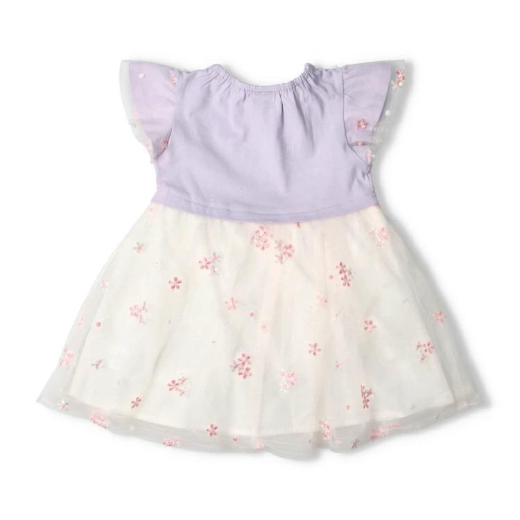お花の刺繍が入ったチュールのスカートに袖にもチュール使い。肩にはリボン。ガーリーなプリンセスみたいなワンピース。襟ぐり後ろ部分がゴム仕様になっているので、着脱は楽ちん!お誕生日会や特別な日にもオススメなアイテム。【アイテム】トップス シンプル ガーリー フェミニン カジュアル お洒落 オシャレ かわいい 可愛い 普段着 デイリーウェア お出かけ着 お外着 お外遊び着 子ども こども 女児 女の子 ガールズ キッズ ベビーサイズ トドラーサイズ 幼稚園 保育園 小学校 通園 通学 小学生 2025年春夏物新作 丸高衣料 ラベンダー 薄紫色 ピンク お姫様 フラワー りぼん クレセント