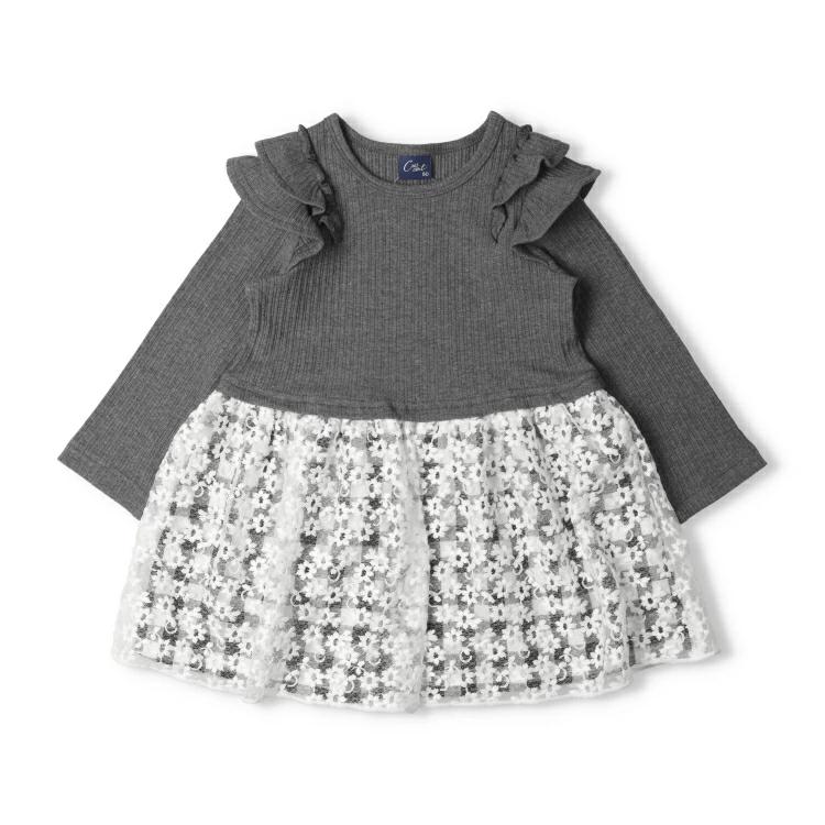 身頃は縦縞模様の凹凸感があり、伸縮性、ストレッチ性があって伸びの良いテレコ素材、スカート部分はチェック柄生地とお花模様のチュールの重ね使い。肩のフリルも女子らしいポイント!1枚でコーディネートが決まるドッキングデザインの長袖ワンピース。【アイテム】トップス シンプル ガーリー フェミニン カジュアル お洒落 オシャレ かわいい 可愛い 普段着 デイリーウェア お出かけ着 お外着 お外遊び着 子ども こども 女児 女の子 ガールズ キッズ ベビーサイズ トドラーサイズ 幼稚園 保育園 小学校 通園 通学 小学生 2025年春夏物新作 丸高衣料 ロングスリーブ 長袖 ダークグレー 灰色 レッド ピンク 朱色 赤色 クレセント フラワー 花柄