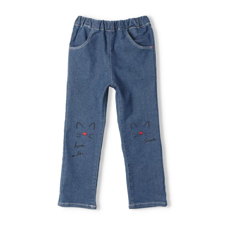 ストレッチ入り生地で動きやすいデニムパンツ、ジーンズ。裾にハートのアップリケと裾レースのデザインと鼻がハートになったネコちゃんの刺繍が入ったデザイン。春のお出かけにもオススメな女の子らしいアイテム。【アイテム】ナチュラル シンプル ベーシック フェミニン ガーリー 無地 カジュアル お洒落 オシャレ かわいい 大人可愛い 普段着 デイリーウェア お出かけ着 お外着 外遊び着 ロング丈 長丈 長ズボン フル丈 ボトムス 子ども こども 女児 女の子 ガールズ キッズ ベビーサイズ トドラーサイズ 幼稚園 保育園 小学校 通園 通学 小学生 2025年春夏物新作 丸高衣料 ネイビー 紺色 ブルー 青色 猫 ねこ 動物 アニマル クレセント