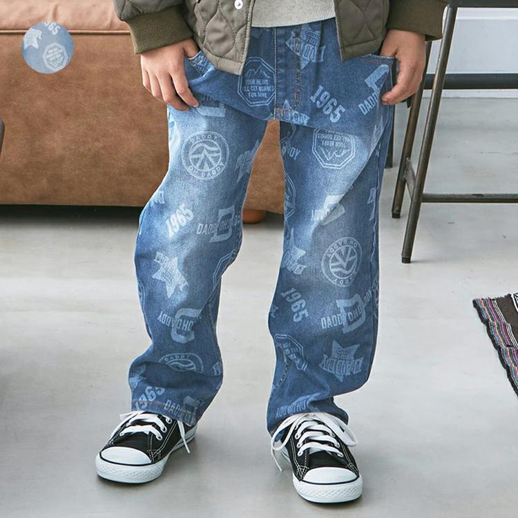 ダディオダディのロゴデザインの総柄がプリントされたストレッチデニムパンツです。柔らかく伸びの良いストレッチデニム生地で、履きやすく動きやすいのが特徴です!厚すぎない10オンスのデニムなので、季節を問わず、幅広いシーズンで活躍します。前身頃と後ろ身頃にはヴィンテージ感が出るようにブラスト加工が施されており、履くだけで雰囲気が出るアイテムです。ゆったりめのストレートシルエットで、カジュアルに履くことができます。同じデザインのスクールサイズ(140,150,160cm)はV53025になります。【アイテム】シンプル ベーシック カジュアル お洒落 オシャレ かっこいい かわいい 可愛い 普段着 お外着 お外遊び着 デイリーウェア お出かけ着 ロング丈 長丈 長ズボン フル丈 ボトムス 子ども こども 男児 男の子 ボーイズ キッズ ベビーサイズ トドラーサイズ 幼稚園 保育園 小学校 通園 通学 小学生 2024年秋冬物新作 丸高衣料 ネイビー コン 紺色 ブルー 青 ダディオダディ