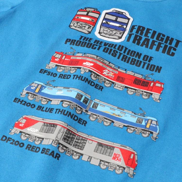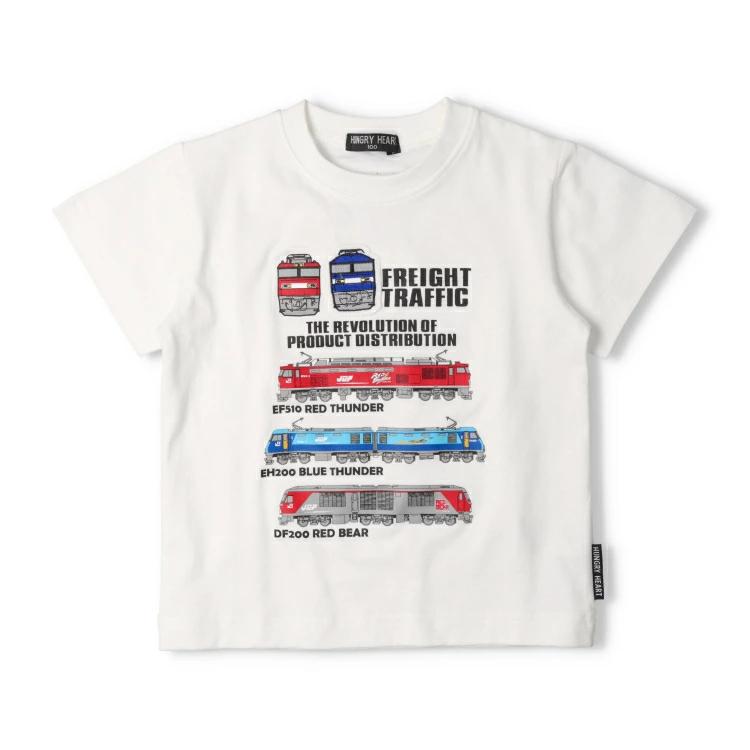 男の子が大好きな電車アイテム!人気のJR貨物列車デザイン!貨物列車をけん引している機関車のレッドサンダー、ブルーサンダー、レッドベアの3車体のプリント入りの半袖Tシャツ。【アイテム】トップス カジュアル お洒落 オシャレ かっこいい かわいい 可愛い 普段着 デイリーウェア お出かけ着 お外遊び着 子ども こども 男児 男の子 ボーイズ キッズ ベビーサイズ トドラーサイズ 幼稚園 保育園 小学校 通園 通学 小学生 2025年春夏物新作 丸高衣料 鉄道 子鉄 車両 電車 電鉄 トレイン ホワイト 白色 ブルー 青色 ハングリーハート コットン100% 綿100%