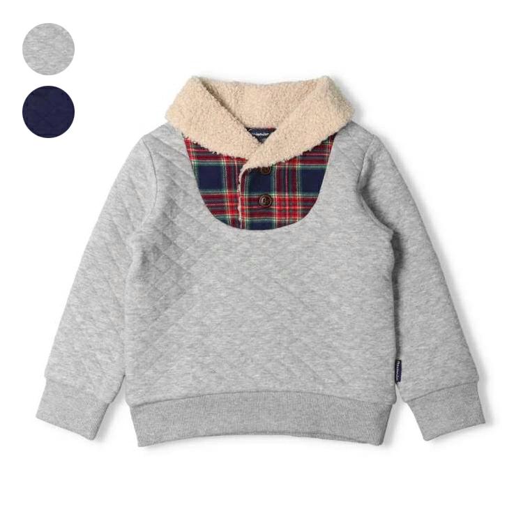 秋冬らしい中綿入りのキルティング、ニットキルト素材のトレーナー。チェック柄の飾り布の切替デザイン。同じチェック柄切替のキルト素材のパンツ(M53009)、女の子のトレーナー(M62652)もあるので、兄弟姉妹やお友達と男女でアイテム違いでペア、リンクコーデ、お揃い、おそろいコーディネートも楽しめます!【アイテム】トップス カジュアル お洒落 オシャレ かっこいい かわいい 可愛い 普段着 デイリーウェア お出かけ着 お外着 お外遊び着 子ども服 こども服 男児 男の子 ボーイズ キッズ ベビーサイズ トドラーサイズ 幼稚園 保育園 小学校 通園 通学 小学生 2024年秋冬物新作 丸高衣料 ロングスリーブ 長袖 グレー 灰色 コン ネイビー 紺色 ムージョンジョン コットン100% 綿100% 兄妹 姉弟 兄弟 姉妹 お揃い オソロ おそろい お揃いリンク リンクコーデ