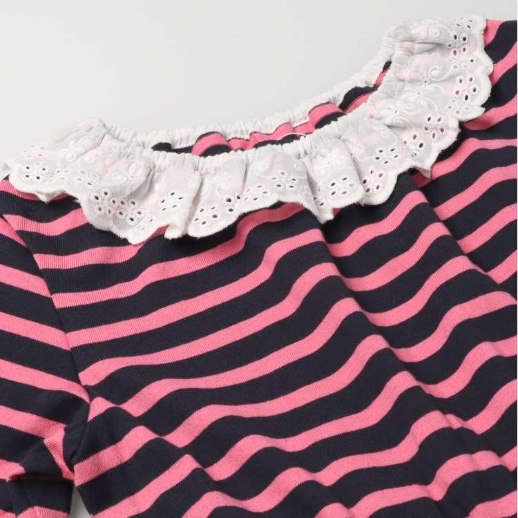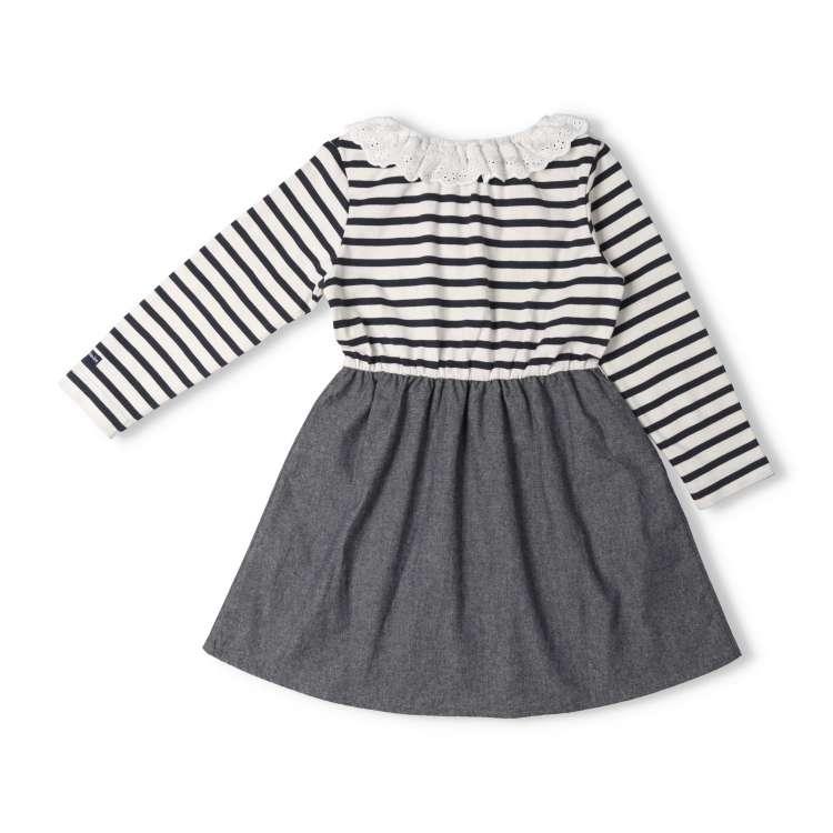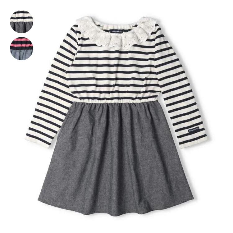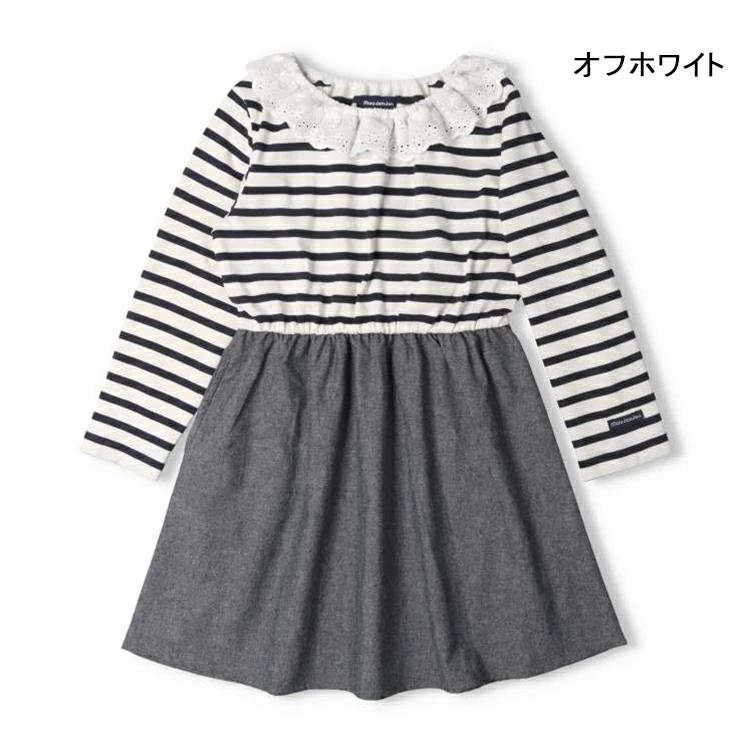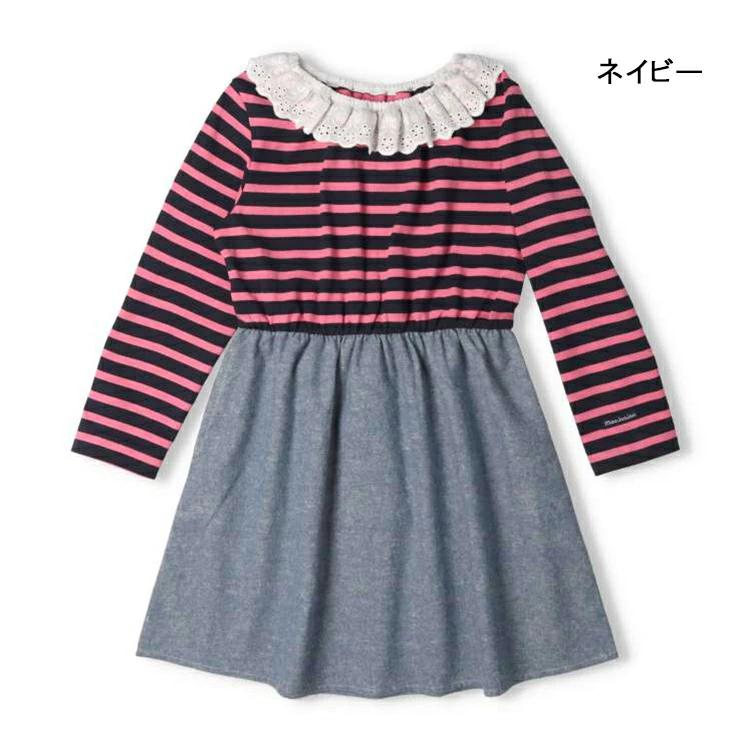 柔らかくて肌触りの良い天竺(綿)100%のTシャツ生地から、ネルシャツ素材のスカートが切替になった長袖ワンピース。カジュアルなボーダーワンピですが、襟元にはレースが付いているので、お出かけにもピッタリな上品な雰囲気です♪襟元はゴム仕様で、お着替えも楽ちん!爽やかな色遣いのオフホワイトと、差し色のピンクが目を惹くネイビーの2色展開です。同じボーダー柄を使ったロンパース(M52704・M62702)、ロンT(M52804・M52806)があるので、兄弟姉妹やお友達と男女でペア、リンクコーデ、お揃い、おそろいコーディネートも楽しめます!【アイテム】長袖 ロングスリーブ トップス シンプル ガーリー フェミニン カジュアル お洒落 オシャレ かわいい 可愛い 普段着 デイリーウェア お出かけ着 お外着 お外遊び着 子ども こども 女児 女の子 ガールズ キッズ ベビーサイズ トドラーサイズ 幼稚園 保育園 小学校 通園 通学 小学生 2024年秋冬物新作 丸高衣料 ブルー 青色 コン ネイビー 紺色 オフホワイト ホワイト 白 兄妹 姉弟 兄弟 姉妹 お揃い オソロ おそろい お揃いリンク リンクコーデ ペア シミラールック ムージョンジョン