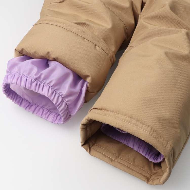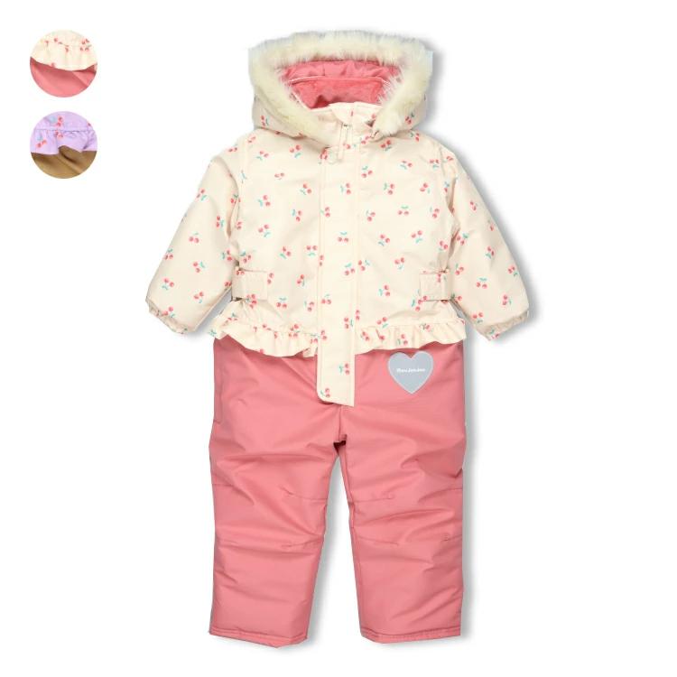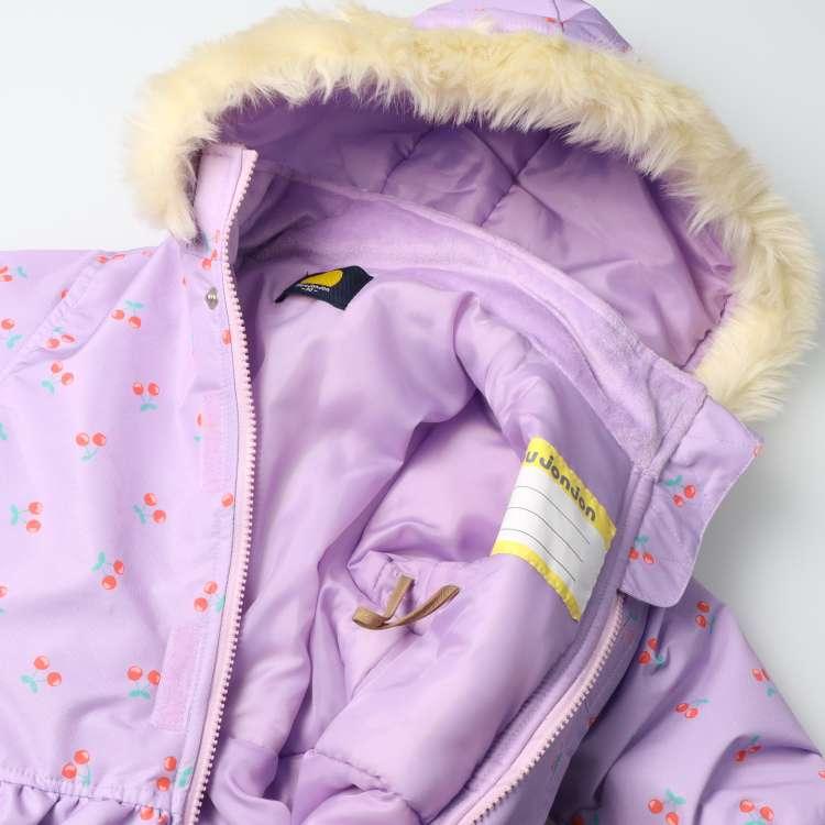 スノーコンビ・ジャンプスーツ・スキーウェアタイプのつなぎ!雪遊びやお外遊びにも!!足部分は二重構造になっているので、ナイロン部分を中に入れてスノーブーツを履いて、スノーブーツの上から被せると足元から雪が入りにくい!ポケットの中のひも、脇部分のひもを調節する事で、手足部分の長さ調節も可能です。お洋服の上から着ることを考えて作られており、大き目の作りなので、ジャストサイズをオススメします。通園、通学の際にもぴったり☆フードはボタンで取り外し可能です!首元衿内側部分はフリース素材で首元も暖か♪表は耐水圧2000mmです!(完全防水ではありません。撥水スプレーとの併用がオススメです。)同じチェリー柄で脚絆、足カバー(M63881)やスノーグローブ、手袋(M63880)もあるので、更なる防寒も可能です!女の子らしいチェリーの総柄と無地の切替デザイン。【アイテム】 カジュアル お洒落 オシャレ かっこいい かわいい 可愛い 普段着 デイリーウェア お出かけ着 ロングスリーブ 長袖 アウター ブルゾン ジャンパー コート ジップアップ フロントジップ 子ども こども 女児 女の子 ガールズ キッズ ベビーサイズ トドラーサイズ 幼稚園 保育園 小学校 通園 通学 小学生 2024年秋冬物新作 丸高衣料 切替 雪遊び スキー スノーボード ソリ遊び ムージョンジョン サクランボ さくらんぼ 果物 フルーツ ハート オフホワイト 白色 ラベンダー パープル 薄紫色