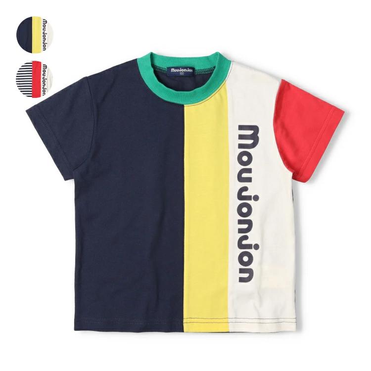 切替の配色デザインがお洒落な半袖Tシャツ。moujonjonのロゴのプリントも目をひきます!【アイテム】トップス カジュアル お洒落 オシャレ かっこいい かわいい 可愛い 普段着 デイリーウェア お出かけ着 お外着 お外遊び着 子ども服 こども服 男児 男の子 ボーイズ キッズ ベビーサイズ トドラーサイズ 幼稚園 保育園 小学校 通園 通学 小学生 2025年春夏物新作 丸高衣料 ネイビー 紺色 レッド 赤色 ムージョンジョン コットン100% 綿100%