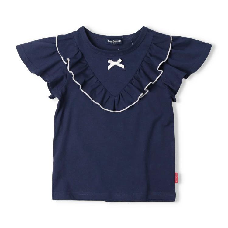 前のVラインのフリルデザインにリボンのモチーフ。袖もフリル。シンプルでも女の子らしい半袖Tシャツ。【アイテム】トップス シンプル ガーリー フェミニン カジュアル お洒落 オシャレ かわいい 可愛い 普段着 デイリーウェア お出かけ着 お外着 お外遊び着 子ども こども 女児 女の子 ガールズ キッズ ベビーサイズ トドラーサイズ 幼稚園 保育園 小学校 通園 通学 小学生 2025年春夏物新作 丸高衣料 ホワイト 白色 ネイビー 紺色 ムージョンジョン りぼん フリフリ コットン100% 綿100%