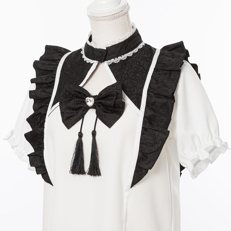 配色部分にはサテンのジャガード生地を使用しています。首元のスナップ釦で着脱可能です。
