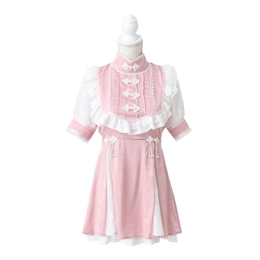 パールチャイナ釦で遊び心をプラスし、スカートはレース生地とのキュートな切り替えデザイン
