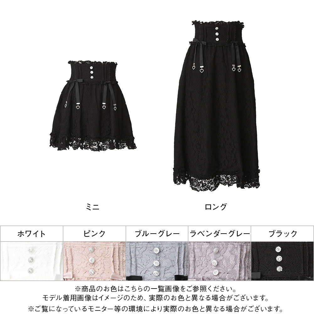 選べる2丈の上品なレースフレアスカートが登場♪【デザイン】上品なレースを使用したフリルたっぷりのスカートです。ミニ丈とロング丈から選べるのでお好みの丈感でコーデして頂けます。ハイウエストデザインなので、スタイルよく見せてくれます。ウエスト部分にはキラキラビジューボタンとリボンがワンポイントになっています。リボンは安全ピンで取り外し可能なので、リボンなしでもかわいく着用できます♪【素材】レース素材と生地を重ねています。本体裏地付きです。ホワイトは同色のインナーを着用をオススメ致します。【コーディネート】上品な大人っぽい雰囲気のコーデにおすすめのアイテムです。ボウタイリボンブラウスやハイネックのブラウスにも合います♪《透け感》なし 《生地の厚さ》普通 《裏地》あり 《伸縮性》なし《生産国》中国