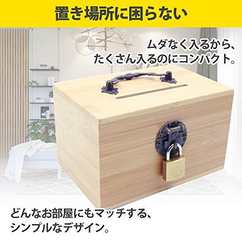 【硬貨でもお札でも気にせず入る】お札が折りたたまずに入る。同じ向きで入れるから中で詰まらない 【20~50万円たまる】お札が120枚入る貯金箱。500円玉・千円札・五千円札を入れると、20~50万円たまる(500円玉だけで20万円) 【置き場所に困らない】ギッシリ入るから、沢山ためられるのにコンパクト。どんなお部屋にもマッチする、シンプルなデザイン 【意志が弱くてもためられる】鍵を貯金箱から離れた部屋で保管するだけで、つい使いたくなる欲望に歯止めが掛かります 【安心の素材】竹はどの木材より硬く中の湿度を整えてくれる、長期の保存箱に適した素材です。大切なお金をしっかりと保存します