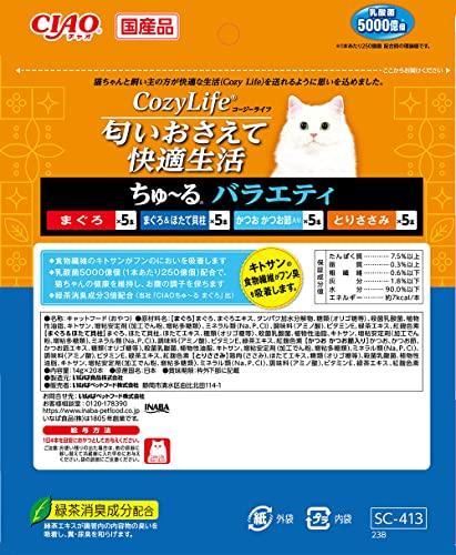 食物繊維のキトサンがフンのにおいを吸着します。乳酸菌5,000億個(1本あたり250億個)配合で猫ちゃんの健康を維持し、おなかの調子を保ちます。緑茶消臭成分3倍配合(当社「CIAOちゅ~る まぐろ」比)。外袋には環境に配慮した紙包材を使用。