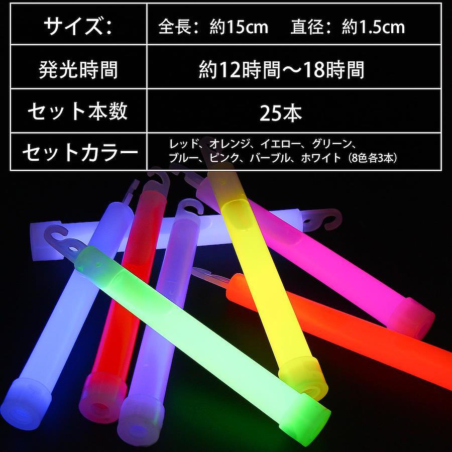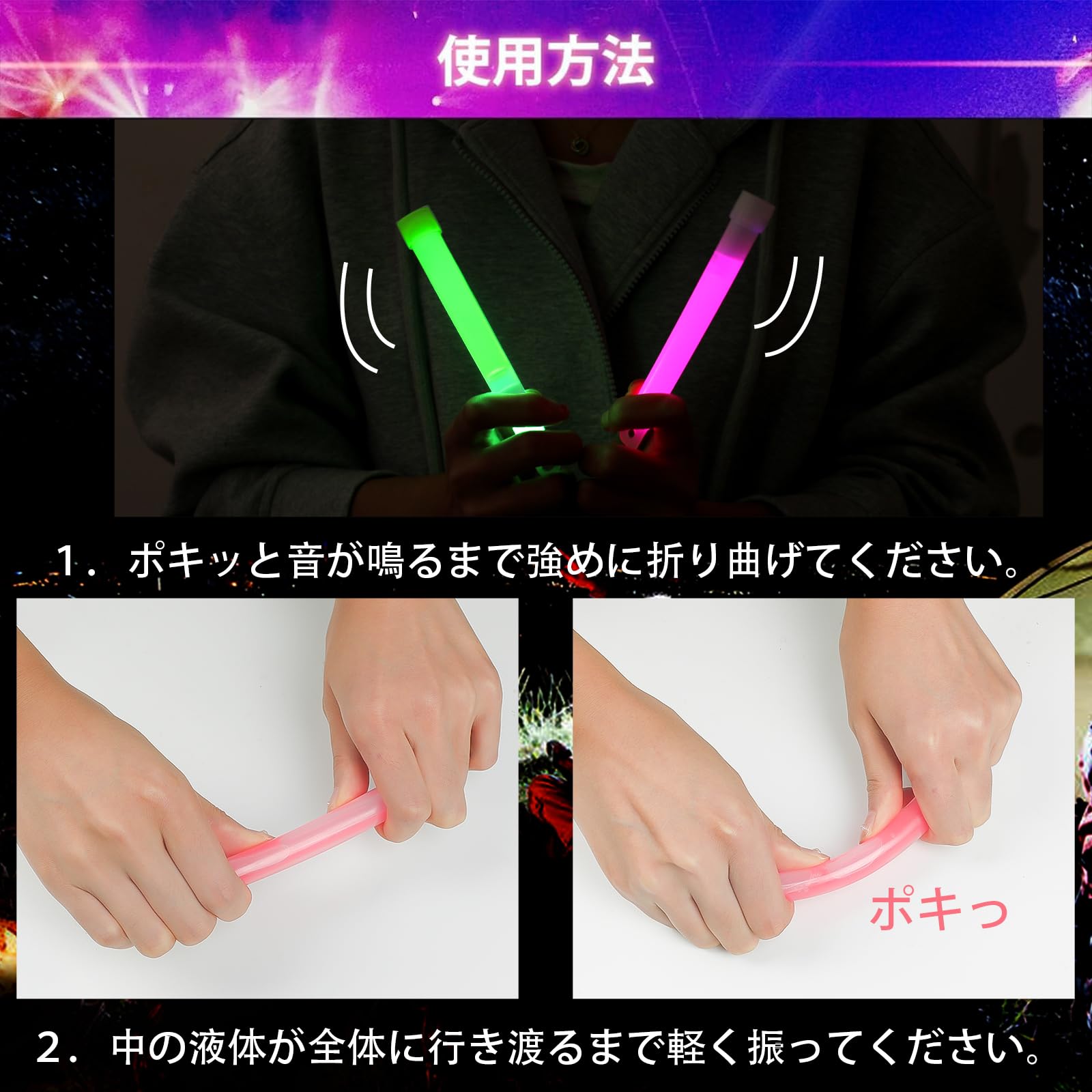 入り数:24本。カラー:レッド、オレンジ、イエロー、グリーン、ブルー、ピンク、バーブル、ホワイト(8各3本)。サイズ:一本約15cm×1.5×1.5cm。使用方法:サイリウムライトをパキッと折って、上下に振るだけで、たちまち華やかな美しい蛍光が出てきます。(夜は蛍光効果がもっと良いです。)適用場合:ライブ、コンサートなどのイベント、クリスマス、ハロウィンパーティーなどに最適です!クラブイベント、カラオケ、宴会、お祝い事、夜遊び、縁日、花火大会、お祭り、キャンプ、マジック、学園祭でも使用できます。防災グッズや災害など緊急時にも:発光時間は約12時間~約18時間。長く輝きを放つので、地震や台風、災害、停電などの緊急時などの災害グッズ、避難グッズ、地震対策グッズとしてもご使用いただけます。注意点:内部には液体があり、破裂することを注意してください。カラーについて、発光前は色が見分けしにくくて、発光後に色目はご確認ください。【免責事項】メーカーによる商品リニューアルに伴いパッケージ(内容量も含む)変更が行われた場合、新パッケージでお届け致します事ご了承願います。