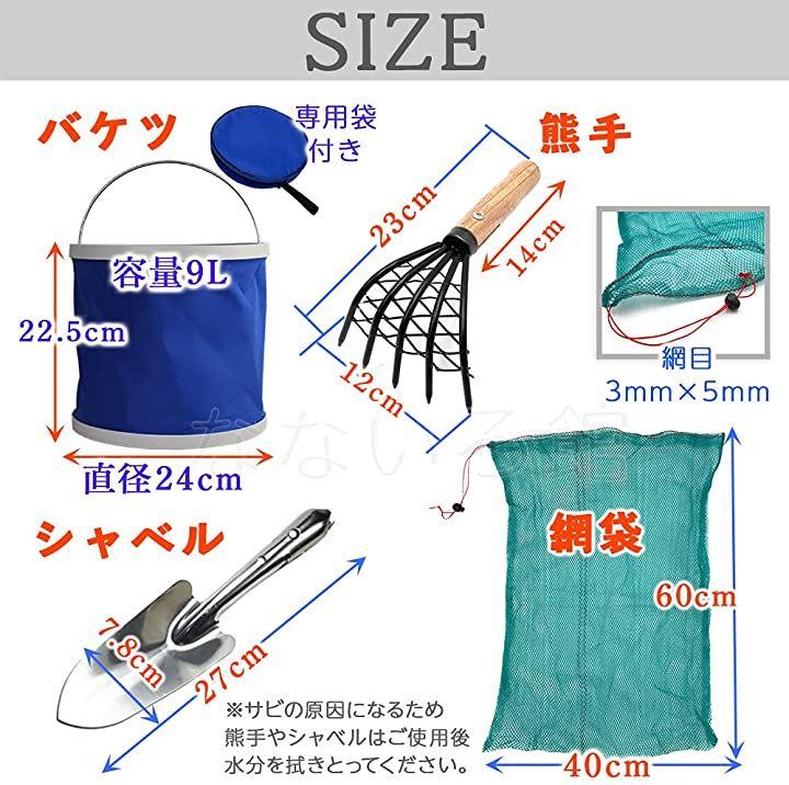 ・「サイズ」 ・熊手 全長23cm 持ち手14cm 歯の幅12cm ・シャベル 全長27cm 幅7.8cm ・網袋 縦60cm 横40cm 網目3mmx5mm ・バケツ 直径24cm 高さ22.5cm(収納時3.5cm) 容量9L