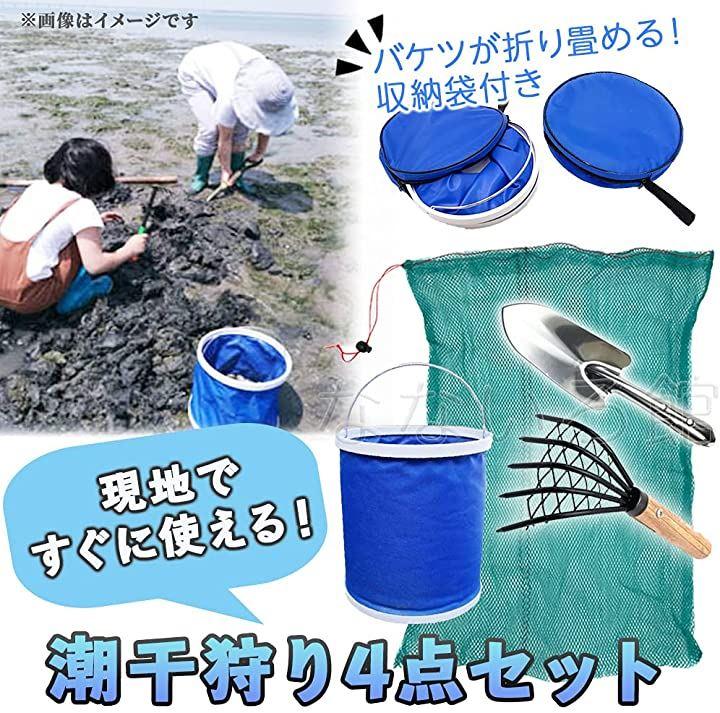 ・現地ですぐにお使いいただける潮干狩り4点セット(折り畳みバケツ・網付き熊手・シャベル・網袋)です。